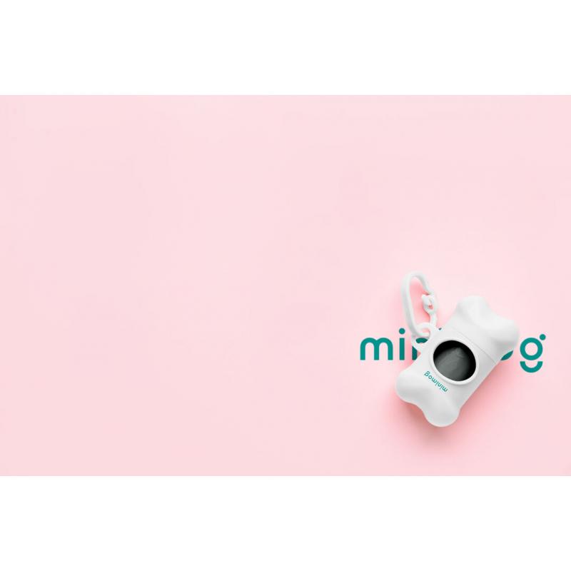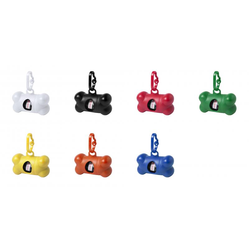 Dispensador de bolsas para mascotas con resistente cuerpo en vivos colores y diseño de hueso. Con mosquetón de transporte a juego y 15 bolsas incluidas.