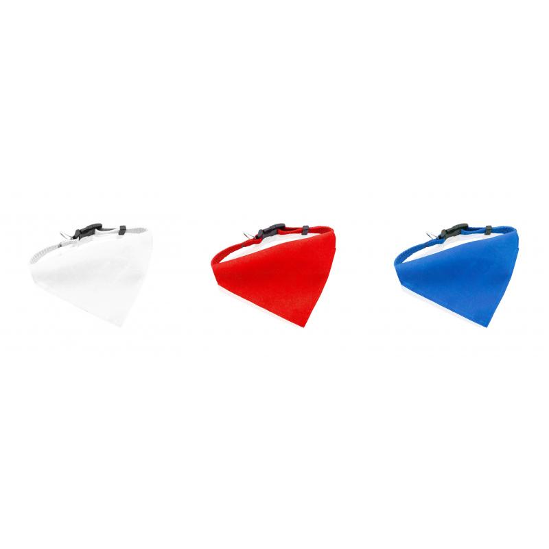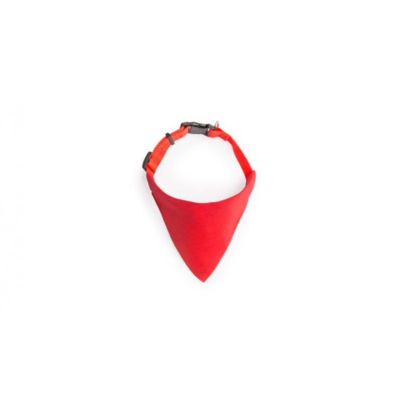 Collar bandana para mascota en resistente y suave poliéster de vivos colores. Con cinta ajustable de cierre de clic y accesorio metálico para cinta de paseo.