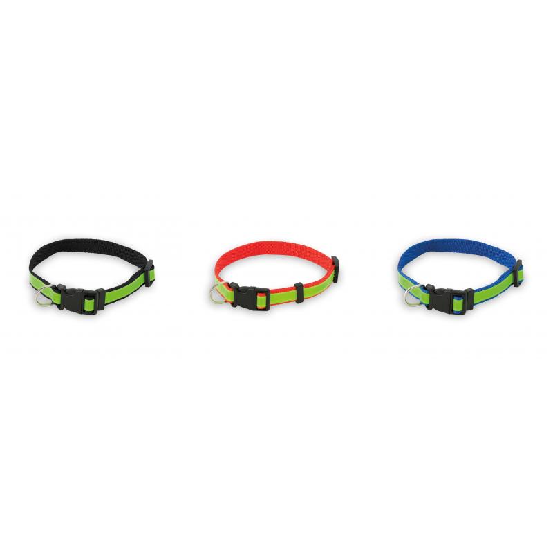 Collar reflectante para mascota en resistente y suave poliéster de vivos colores. Con cinta ajustable de cierre de clic y accesorio metálico para cinta de paseo.