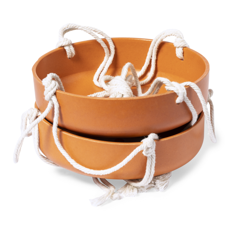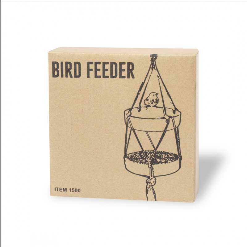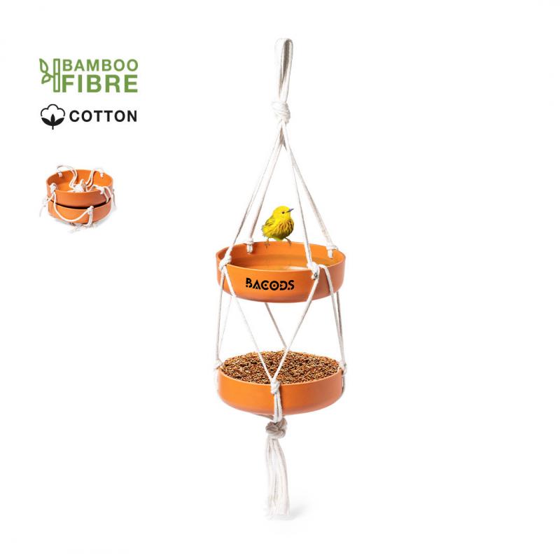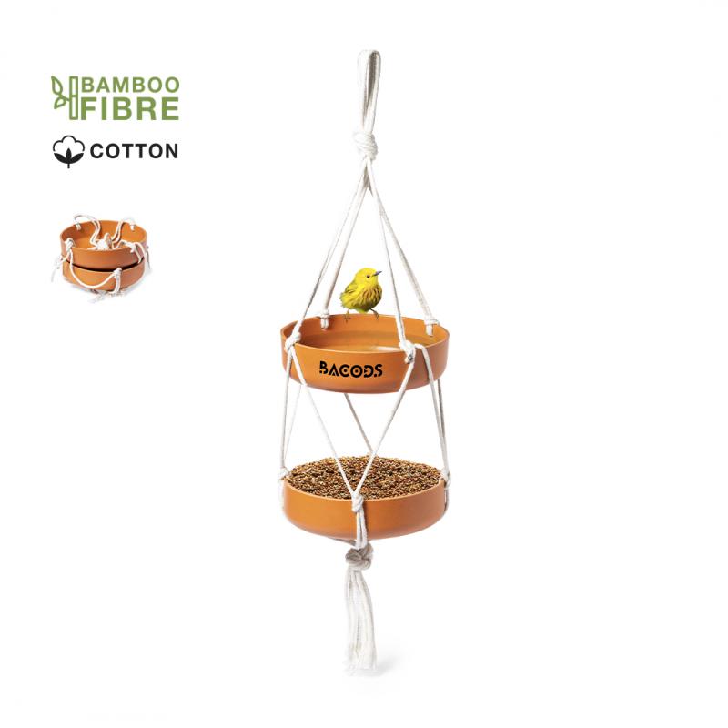 Comedero colgante para pájaro. Con dos recipientes fabricados en fibra de bambú (medidas 15 x 4 cm cada uno) y resistente cuerda de algodón natural. Presentación en caja individual de diseño kraft.