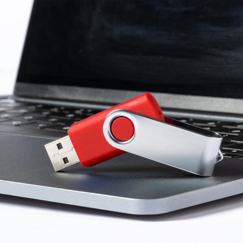 Memoria USB de 8GB de capacidad. Con mecanismo giratorio, cuerpo de suave acabado en ABS y clip metálico. Disponible en variada gama de colores y presentada en estuche individual plateado con ventana.