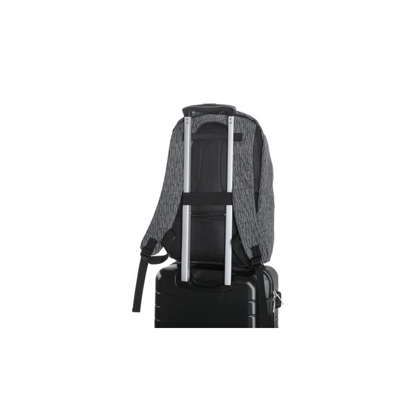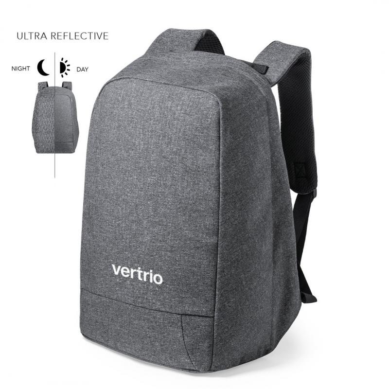 Mochila antirrobo reflectante de alta visibilidad, elaborada en resistente poliéster 600D de calidad premium y acabado en color gris. Fabricada empleando filamentos con gran capacidad para reflejar intensamente la luz, gracias a millones de pigmentos reflectantes y basándose en el principio de la retro-reflexión de la luz, una propiedad de visibilidad nocturna que consiste en la refracción de la luz hacia la fuente de origen de la misma. Resistente a salpicaduras de agua, con bolsillo antirrobo y accesorio para ajuste en trolley. Compartimentos interiores acolchados para ordenador portátil de hasta 15 pulgadas y tablets de hasta 12 pulgadas. Cintas de hombros y espalda acolchadas.
