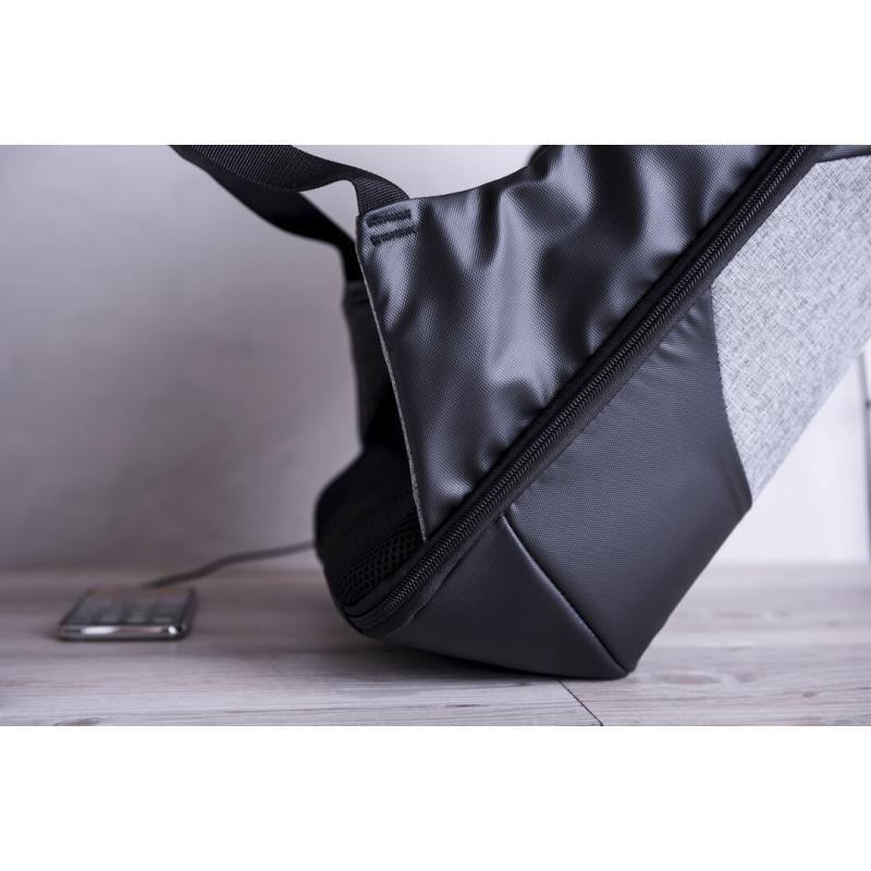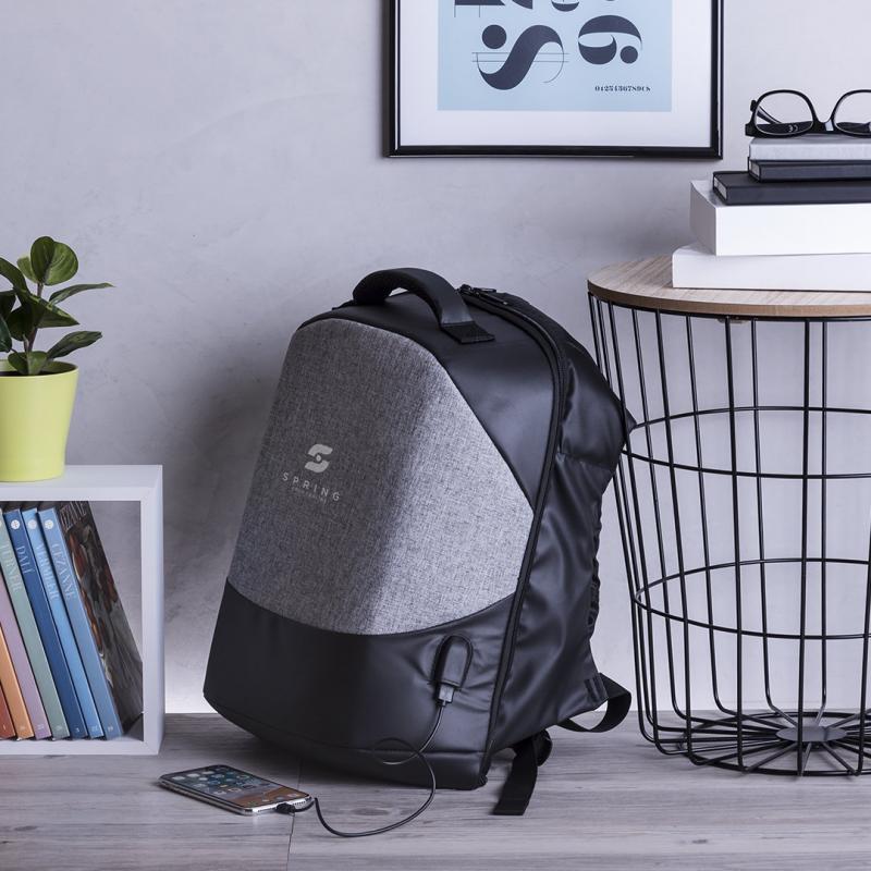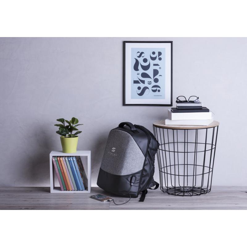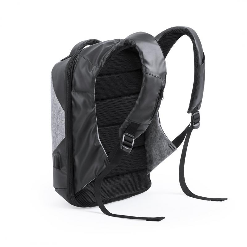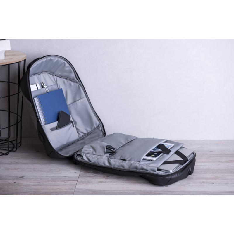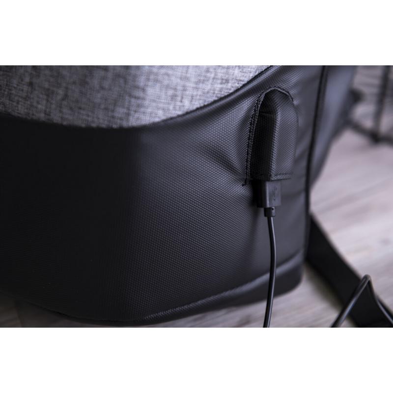 Mochila de negocios antirrobo y repelente al agua en nylon de alta calidad, resistente a cortes y a roces. Con bolsillo antirrobo en la espalda para guardar objetos de valor. Compartimento interior con salida USB para conexión de powerbank -no incluido-. Incluye cable micro USB de 1 metro de largo para total comodidad en la carga de cualquier dispositivo móvil. Bolsillo en cinta derecha con fácil acceso para tarjeta de transporte y otros documentos de uso frecuente. Apertura total 180º para fácil acceso al interior de la mochila. Dos compartimentos interiores independientes y acolchados para ordenador portátil de hasta 15 pulgadas y para tablets de hasta 10 pulgadas. Con multitud de bolsillos interiores y exteriores. Cintas de hombros y espalda con acolchado ergonómico.