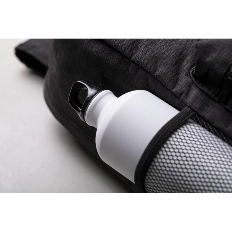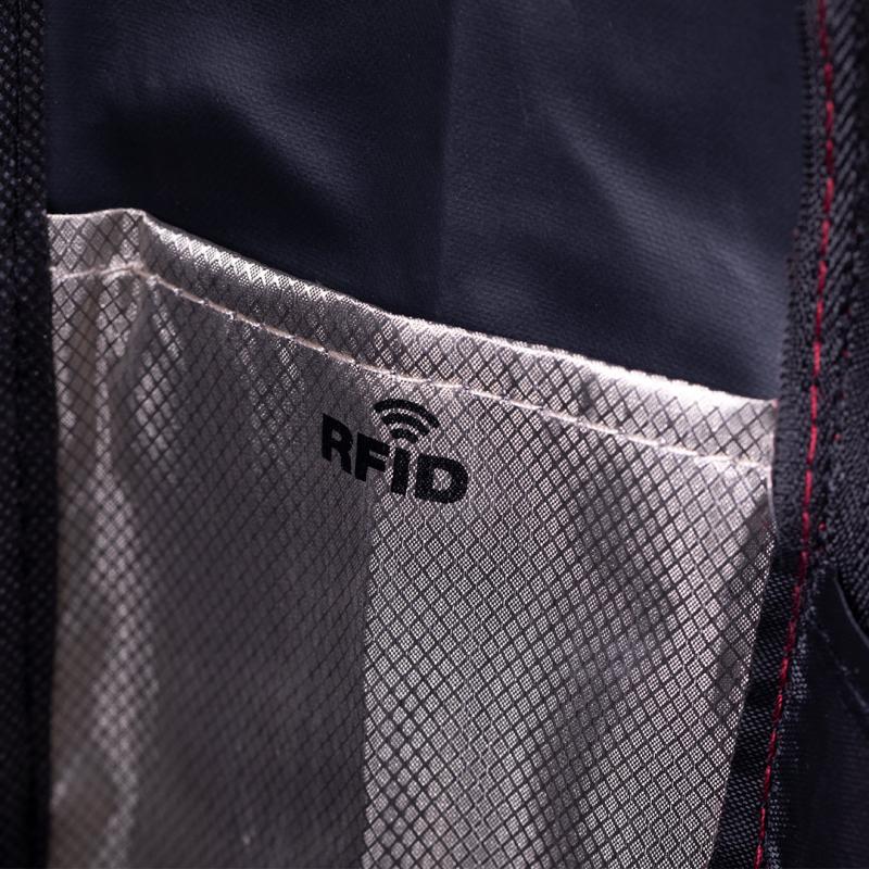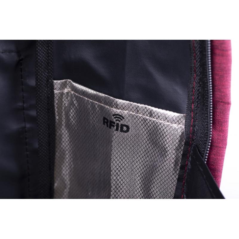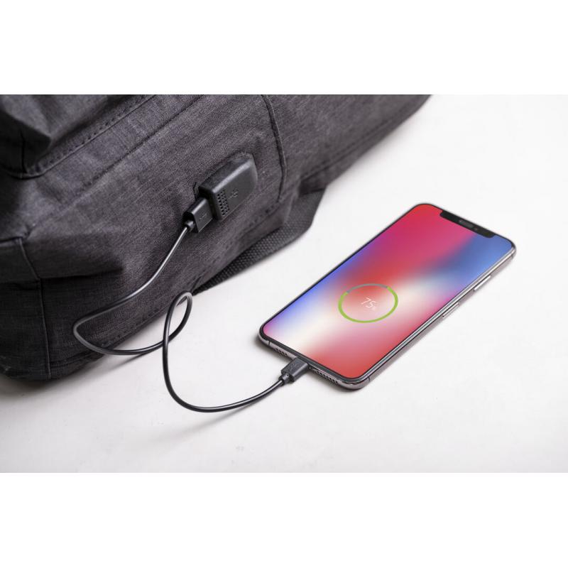 Mochila antirrobo en resistente material poliéster 300D. Con bolsillo antirrobo en la espalda para guardar objetos de valor. Compartimento interior con salida USB para conexión de powerbank -no incluido-. Incluye cable micro USB para total comodidad en la carga de cualquier dispositivo móvil. Bolsillo en lateral con protección RFID y compartimentos interiores acolchados para tablets de hasta 10 pulgadas y portátiles de hasta 15 pulgadas. Cinta para fijación al trolley y disponible en amplia gama de colores, con multitud de bolsillos interiores y exteriores. Cintas de hombros y espalda ajustables con acolchado.