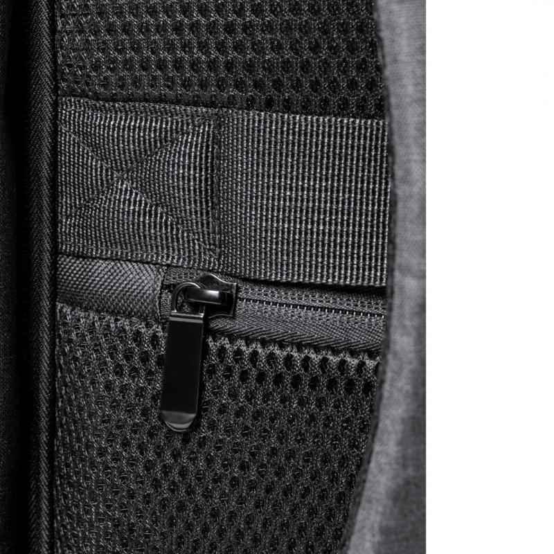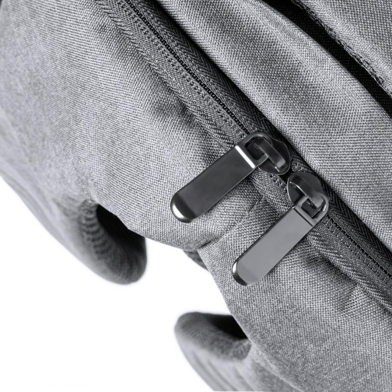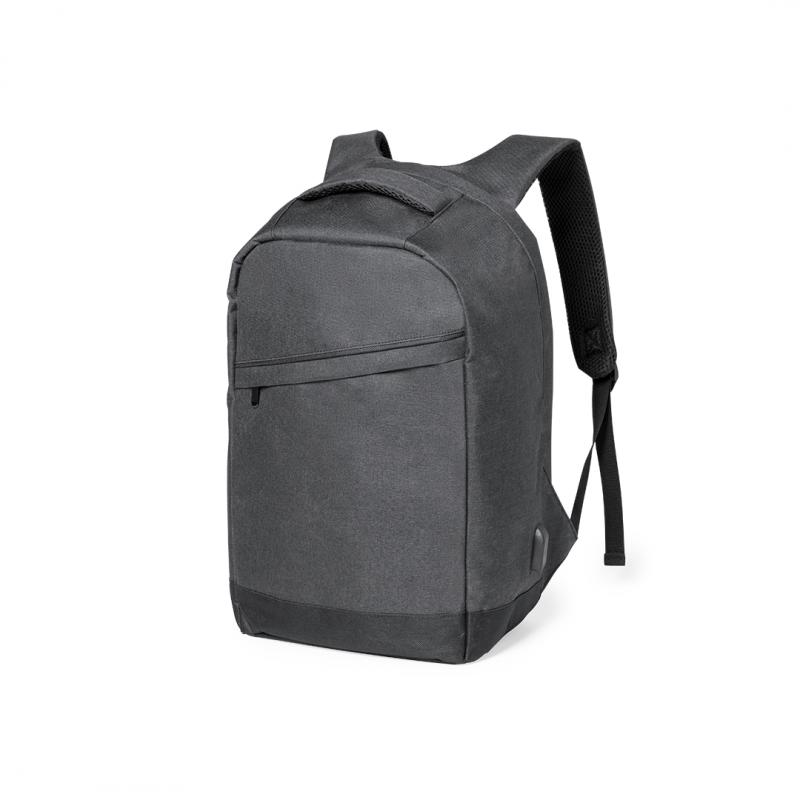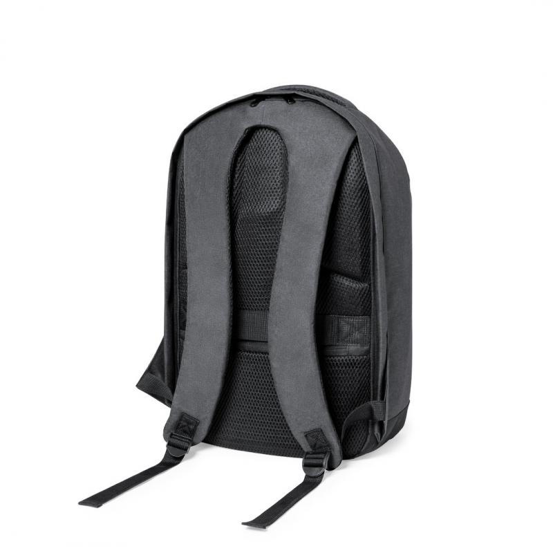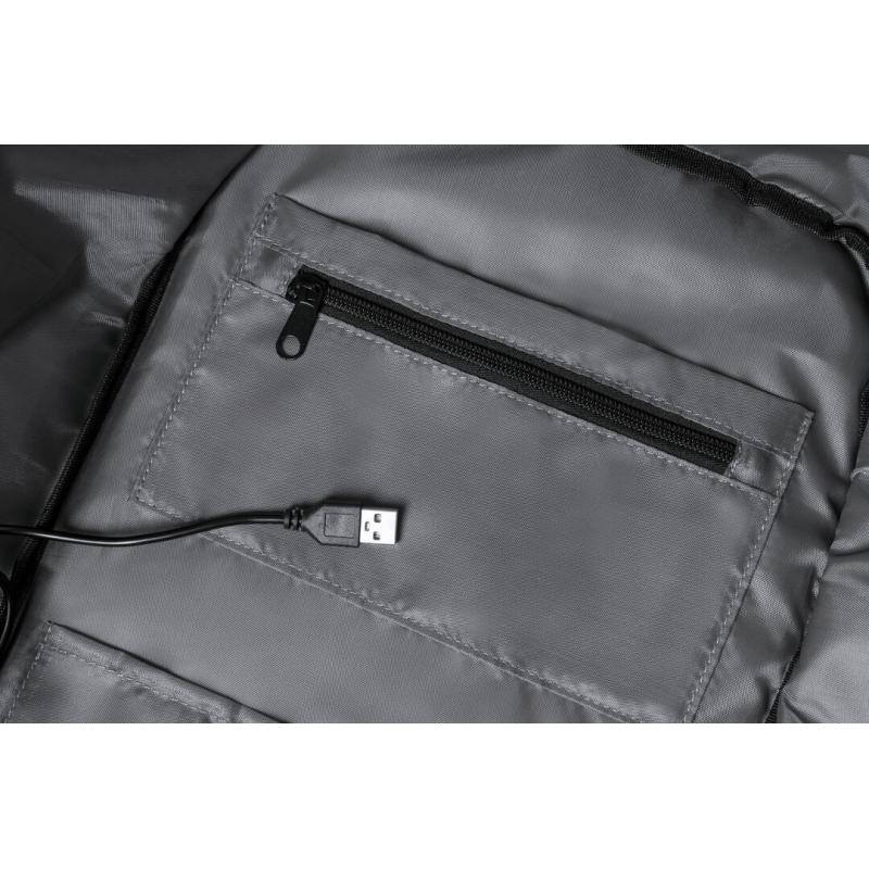 Mochila en resistente poliéster 600D de alta calidad. Con bolsillo antirrobo en la espalda para guardar objetos de valor. Compartimento interior con salida USB para conexión de powerbank -no incluido- y bolsillo exterior con cremallera invisible. Acolchado en asa, parte trasera y cintas para hombros, que además son ajustables. Interior con compartimentos acolchados para ordenador portátil de hasta 15 pulgadas y tablet de hasta 10 pulgadas. Accesorio en espalda para ajuste en trolley.