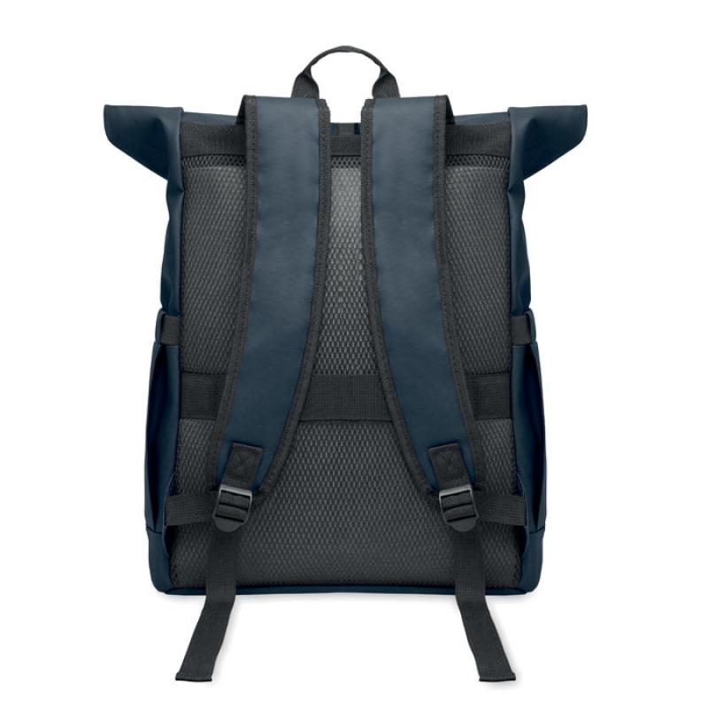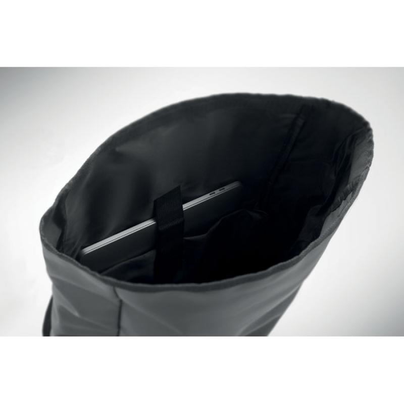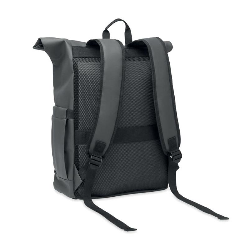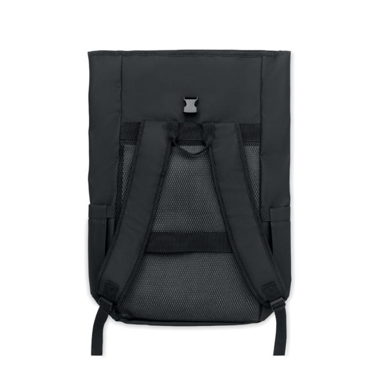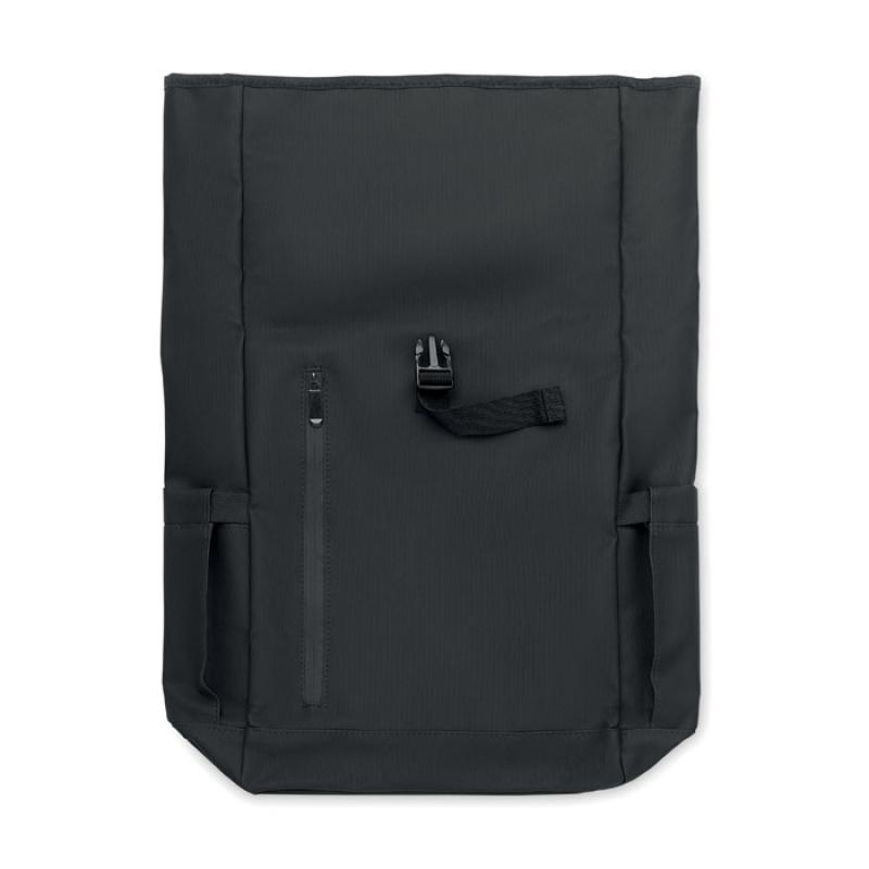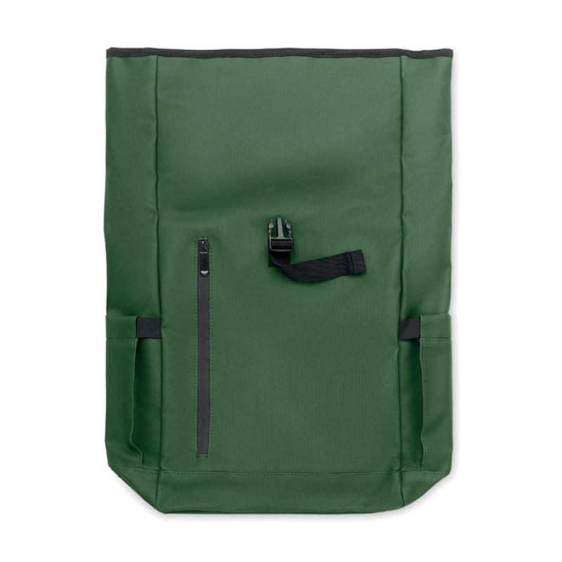 Mochila con cierre rolltop para portátil de 15'' en RPET 600D revestido de PU y forro de poliéster RPET. Espalda acolchada con malla, bolsillo con cremallera y correa para trolley. Bandolera acolchada con acabado interior de malla.Recipiente :