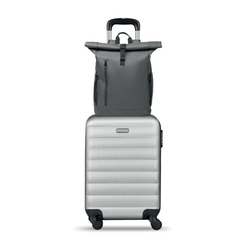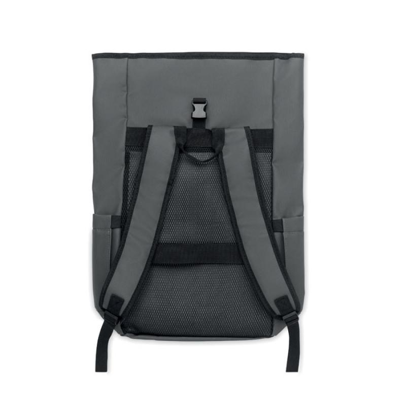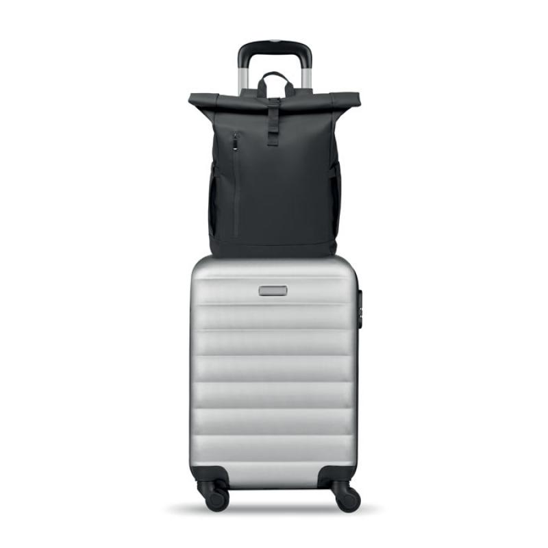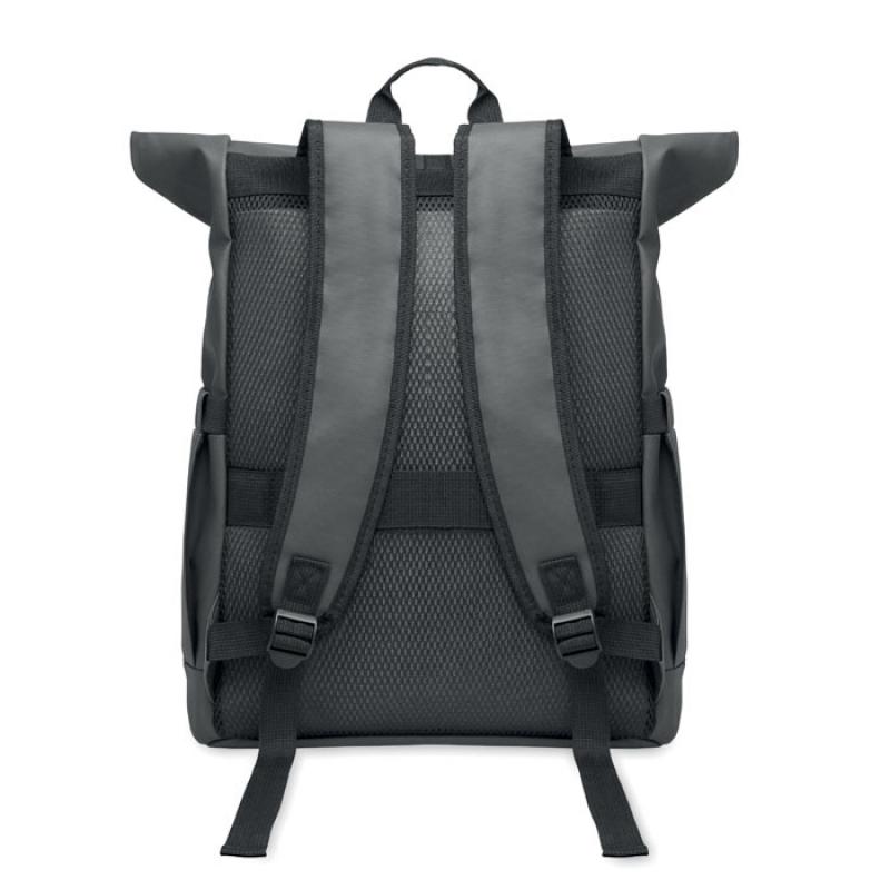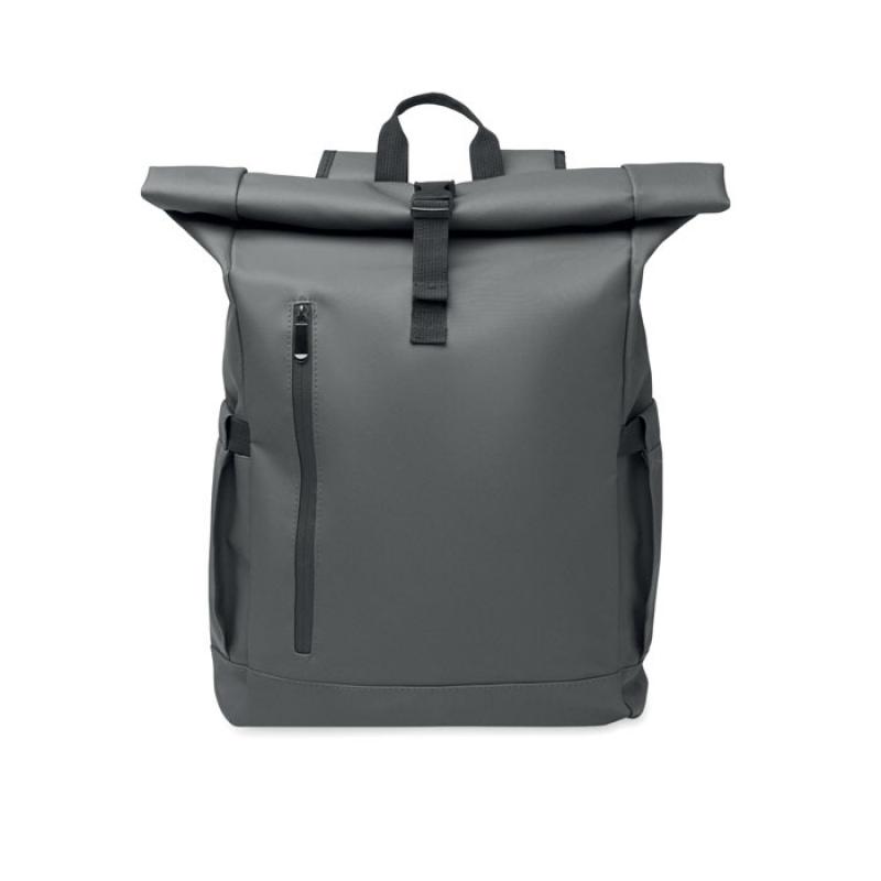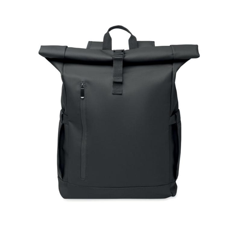 Mochila con cierre rolltop para portátil de 15'' en RPET 600D revestido de PU y forro de poliéster RPET. Espalda acolchada con malla, bolsillo con cremallera y correa para trolley. Bandolera acolchada con acabado interior de malla.Recipiente :