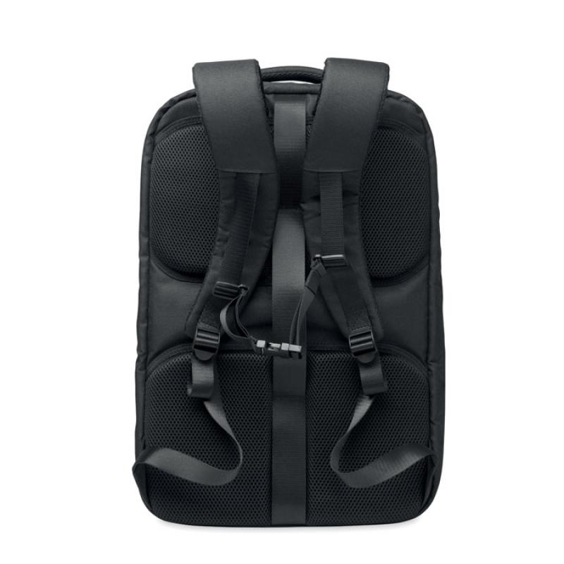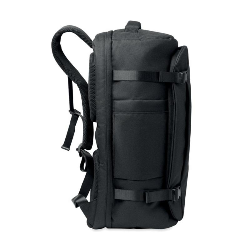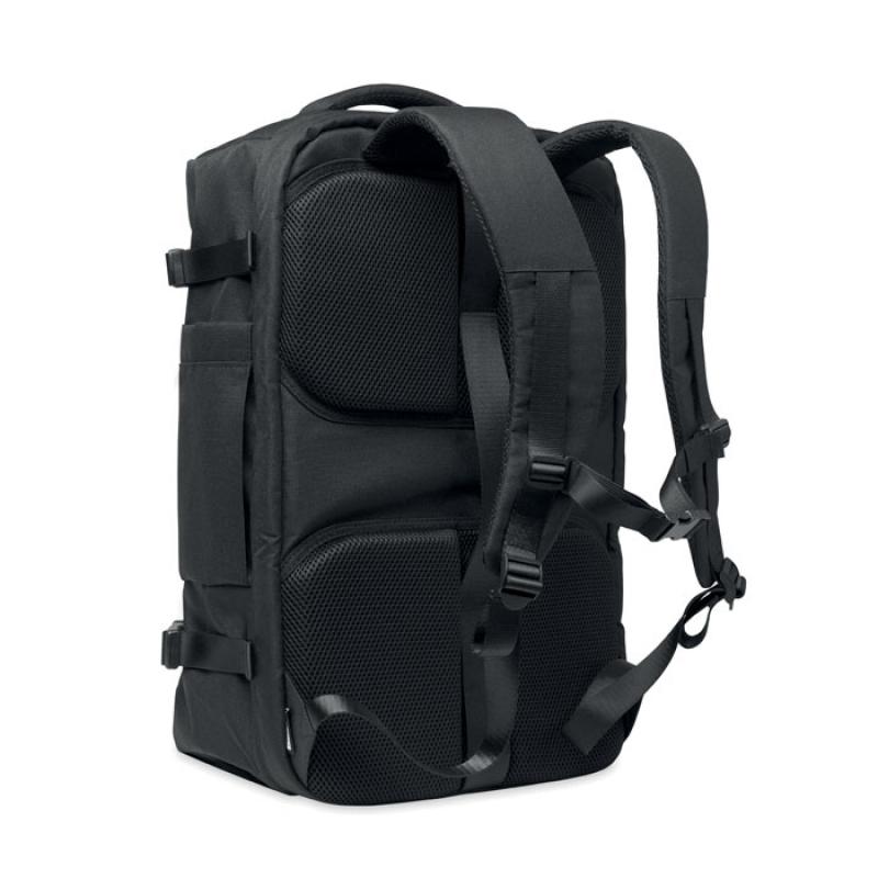 Mochila grande de viaje para portátil de 17'' en poliéster RPET 600D. Cuenta con varios compartimentos como uno principal para la ropa, dos acolchados para el portátil y la tableta y más. Panel trasero acolchado, correa para el hombro y asa de mano.Recipiente :