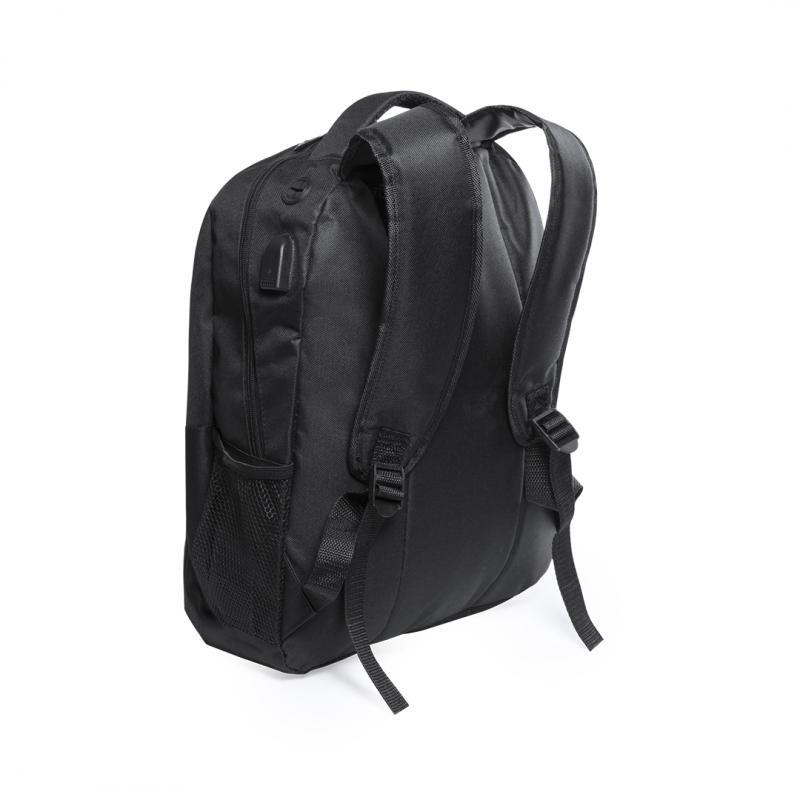Mochila de resistente poliéster 600D en elegante acabado impermeable de color negro y salida para auriculares. Con compartimento interior con salida USB para conexión de powerbank -no incluido-. Interior con compartimento acolchado para ordenador portátil de hasta 15 pulgadas y tablets de hasta 10 pulgadas. Multitud de bolsillos interiores y exteriores. Cintas de hombros y espalda con acolchado ergonómico.