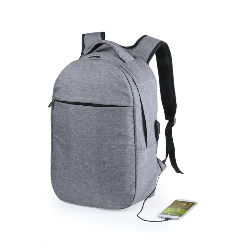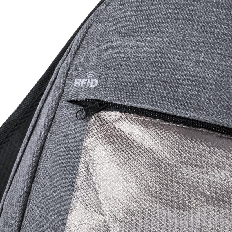 Mochila de seguridad, con diseño urbano en resistente poliéster 300D. Bolsillo interior con protección de seguridad RFID (Identificación por Radio Frecuencia) que mantiene seguros los datos de la tarjeta y demás dispositivos. Compartimento principal con elegante tapeta en la cremallera. Con conexión USB -powerbank no incluido- y bolsillo interior acolchado para ordenador portátil de hasta 15 pulgadas. Parte trasera y cintas acolchadas.