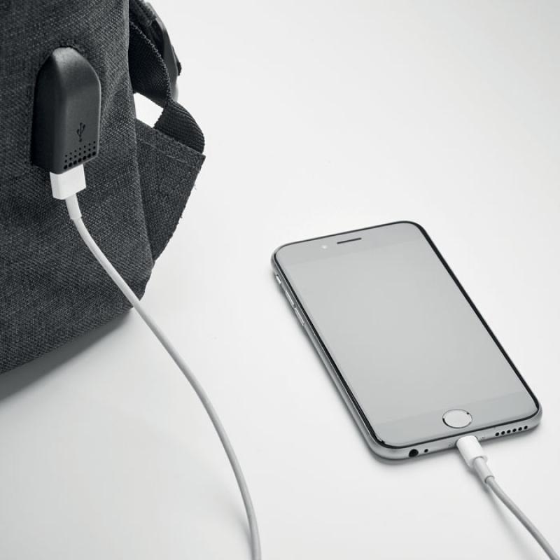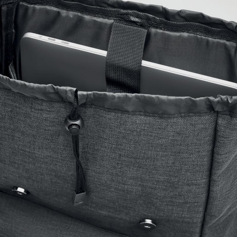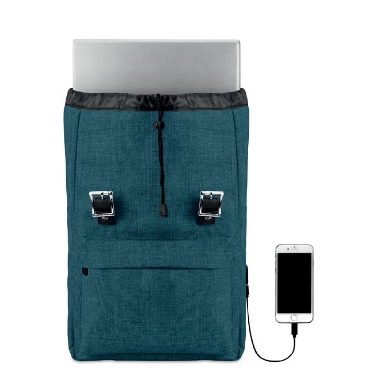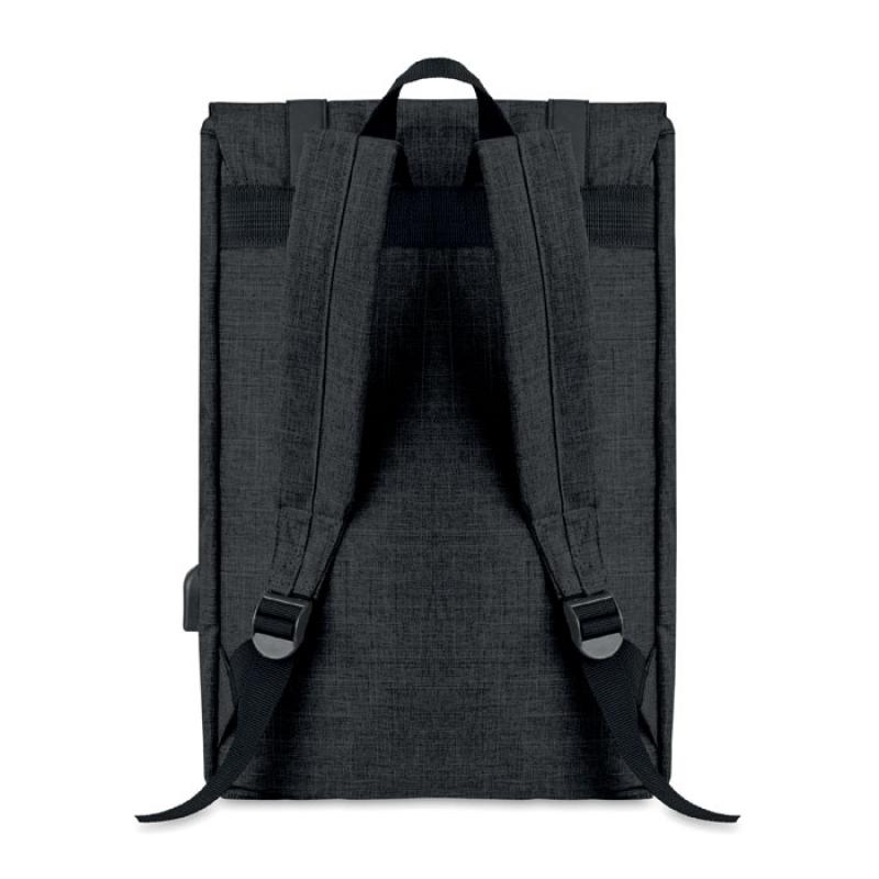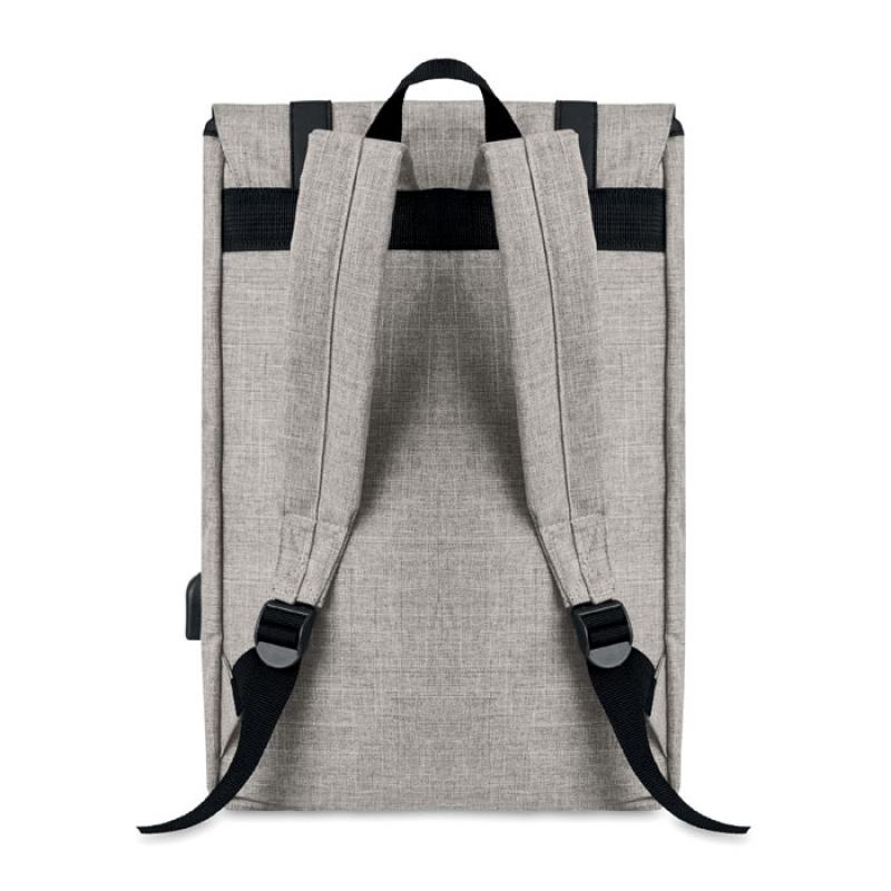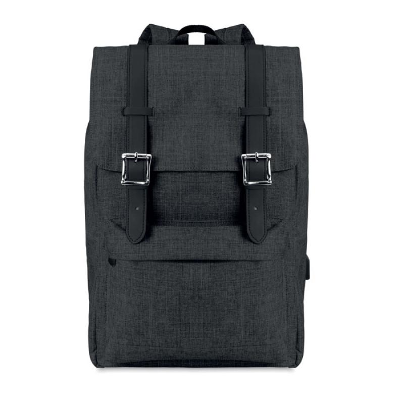 Mochila para portátil de poliéster 600D jaspeada con correa acolchada. Incluye un compartimento principal interno para portátil de 15 pulgadas y un cable de carga USB. Incluye un botón magnético de cierre instantáneo y un compartimento con cremallera en la parte delantera.