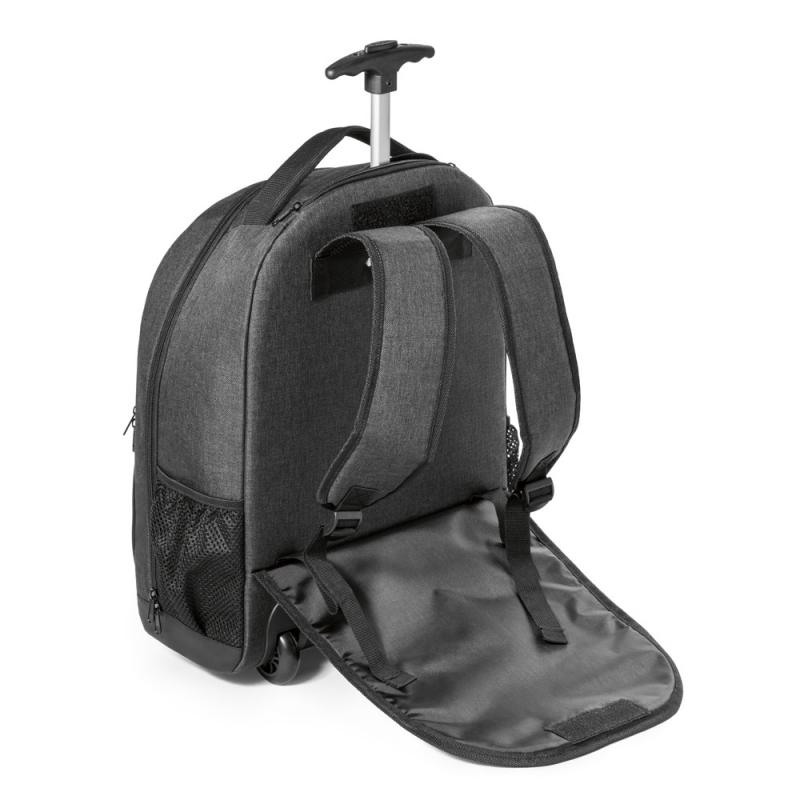 Mochila tipo trolley para ordenador portátil, fabricada en poliéster 600D de alta densidad y poliéster impermeable 600D. Dispone de un compartimento principal para un ordenador de hasta 15,6'', bolsillos laterales de malla, un bolsillo delantero con doble cremallera y asas y espalda acolchadas. Contiene un protector para las ruedas y un asa metálica extensible. Incluye una placa de metal extraíble con imán, para una fácil personalizaciónRecipiente :