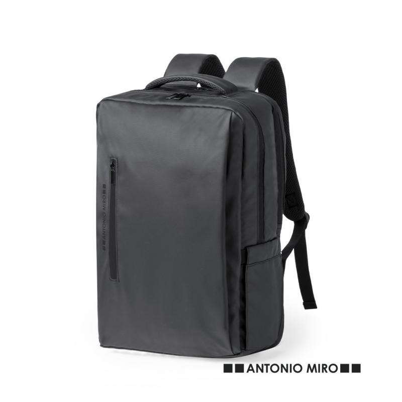 Mochila de Antonio Miró de calidad premium en resistente polipiel de sobrio diseño en color negro. Con cierre de cremallera doble, bolsillo frontal y asa reforzada acolchada. Con acolchado ergonómico en espalda y cintas de hombros, incluye compartimento interior acolchado para portátil de hasta 15 pulgadas y para tablets de hasta 10 pulgadas. Además, con bolsillo antirrobo con cierre de cremallera en la parte trasera. Fundas interiores para bolígrafos y smartphone. Con logotipo de la marca en frontal.