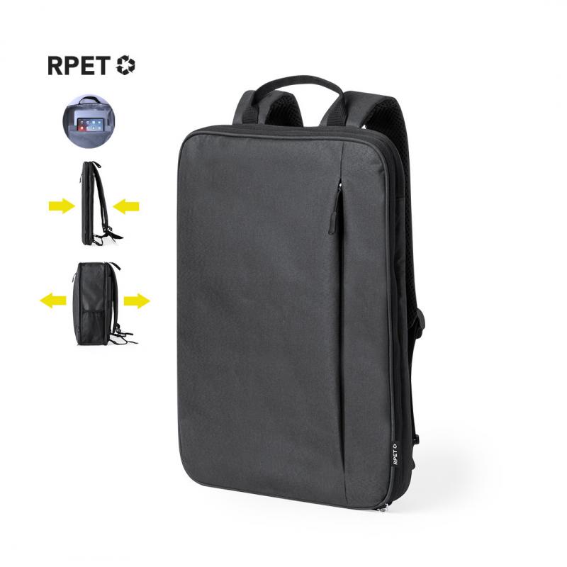 Mochila extensible confeccionada en resistente 600D RPET. Equipada con cierre de cremallera de doble tirador, con posibilidad para ampliar la capacidad. Su interior cuenta con compartimentos acolchados diseñados para tablet de hasta 10 pulgadas y portátil de hasta 15 pulgadas. Las cintas de hombros son acolchadas, ajustables y desmontables, permitiendo guardarlas en el bolsillo trasero. La mochila incluye una cinta para fijarla a las maletas y un asa superior para un fácil transporte en la mano. Logotipo RPET en etiqueta. Presentado en una bolsa individual reciclada. El material RPET se elabora a partir de plástico reciclado, para así fomentar la reutilización de residuos plásticos y ayudar a la sostenibilidad del planeta.