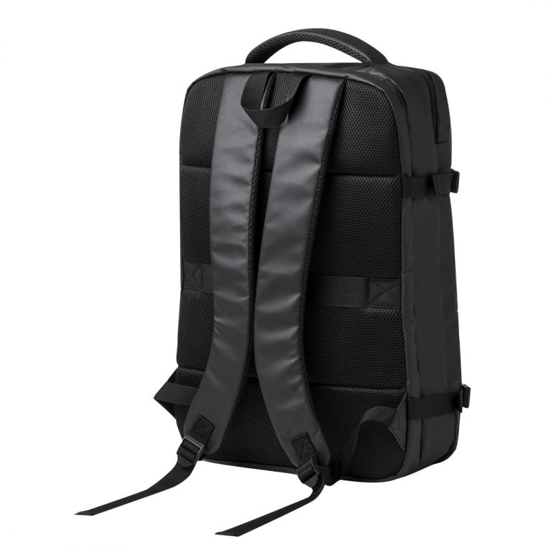 Mochila portadocumentos confeccionada en elegante polipiel. Presenta un diseño urbano que incluye un bolsillo acolchado para portátil de hasta 17 pulgadas. Reforzada con cintas laterales, cuenta con cierre de hebilla de seguridad y compartimentos con cierre de cremallera de doble tirador. Sus cintas de hombros y la espalda están acolchadas y son ajustables. Además, cuenta con un cinta para fijarla en trolley y una asa acolchada para mayor comodidad al usarla como portadocumentos. Presentado en una bolsa individual reciclada.