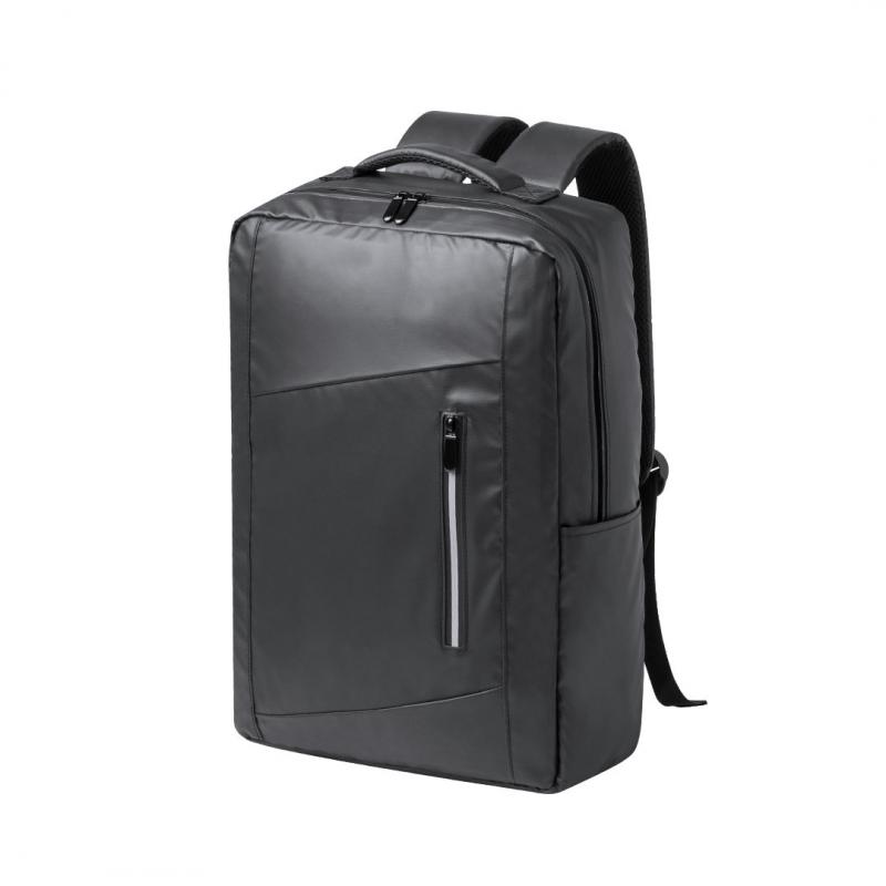 Mochila confeccionada en elegante polipiel. Caracterizada por un diseño urbano que incorpora un bolsillo acolchado para tablet de hasta 10 pulgadas y portátil de hasta 15 pulgadas. Además, cuenta con un bolsillo frontal destacado por una banda reflectante. Espalda y cintas de hombros acolchadas, ajustables y fabricadas con tela transpirable en la parte interior. Incluye un accesorio de ajuste para trolley y una cómoda asa superior acolchada. Presentado en una bolsa individual reciclada.