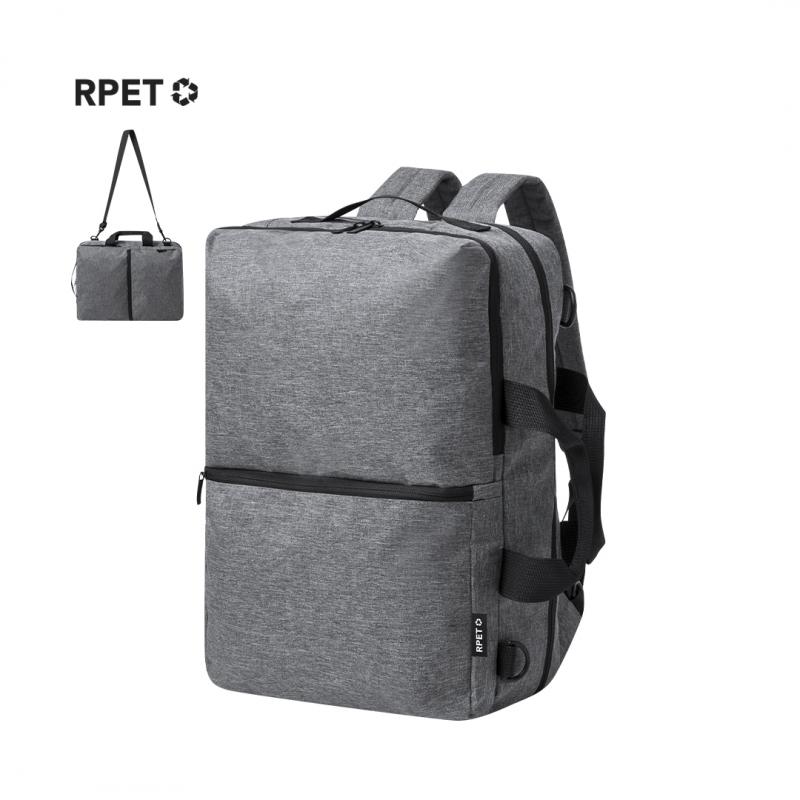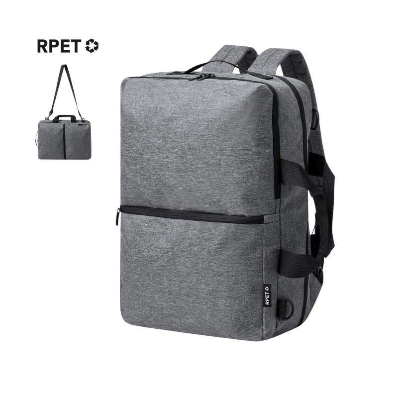 Mochila portadocumentos confeccionada en resistente 600D RPET. Presenta un diseño urbano que incorpora un bolsillo central con cierre de cremallera, y doble tirador. Con interior acolchado para portátil de hasta 15 pulgadas, bolsillo adicional con cierre de doble cremallera y bolsillo frontal. Sus cintas de hombros y la espalda están acolchadas y son ajustables para mayor comodidad. Ofrece tres modalidades de transporte: como mochila, gracias a las tiras de hombros colchadas; como portadocumentos, gracias a su asa de transporte acolgada; y como bandolera gracias a su asa larga ajustable. Está disponible en tres elegantes colores y se presenta de manera sofisticada en una bolsa individual reciclada.El material RPET se elabora a partir de plástico reciclado, para así fomentar la reutilización de residuos plásticos y ayudar a la sostenibilidad del planeta.