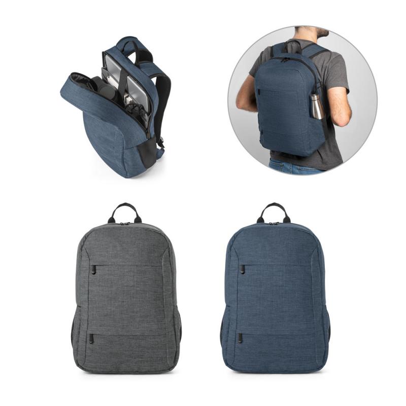 Mochila para portátil 300D PET (100% rPET) y 210D PET (100% rPET) . Compartimento principal acolchado con divisor principal para portátil de hasta 15,6" y tableta de hasta 10,1". Mochila con 2 bolsillos delanteros con cremallera y 2 bolsillos laterales de malla. Espalda y tirantes acolchados, ajustables. La parte trasera incorpora una cinta para trolley, en caso de ser necesario. Diseño ideal para garantizar un excelente almacenamiento para sus viajes de trabajo o de placer. Capacidad hasta 18 litrosRecipiente :
