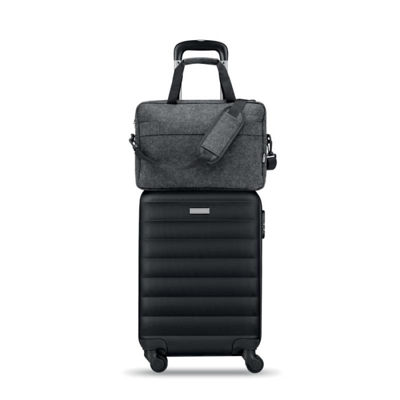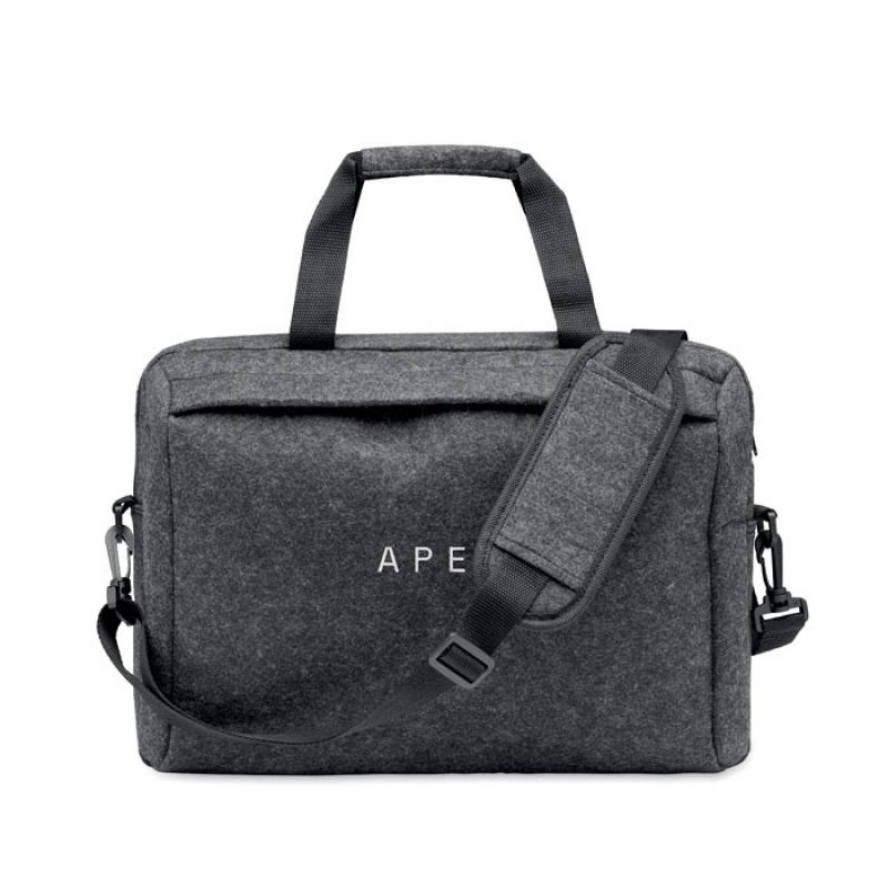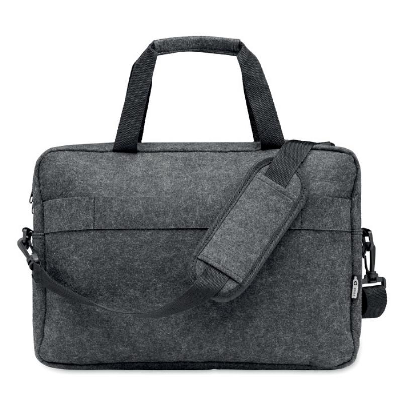 Maletin de fieltro de RPET para portátil de 15'''' que incluye un compartimento interno principal y un bolsillo frontal con cremallera. Incluye correa para el hombro desmontable y ajustable. Sujección para trolley.Recipiente :