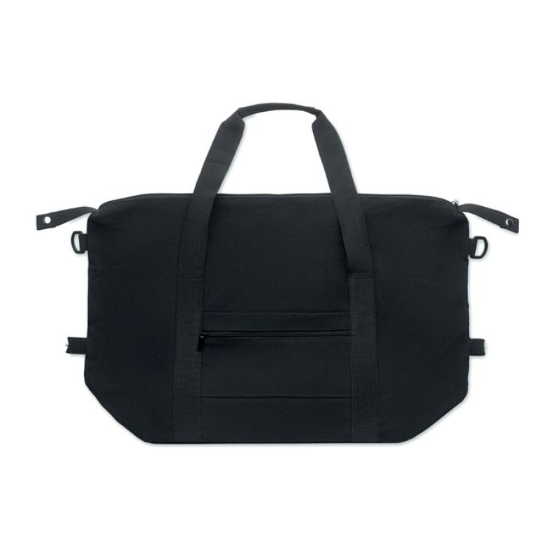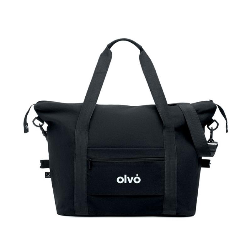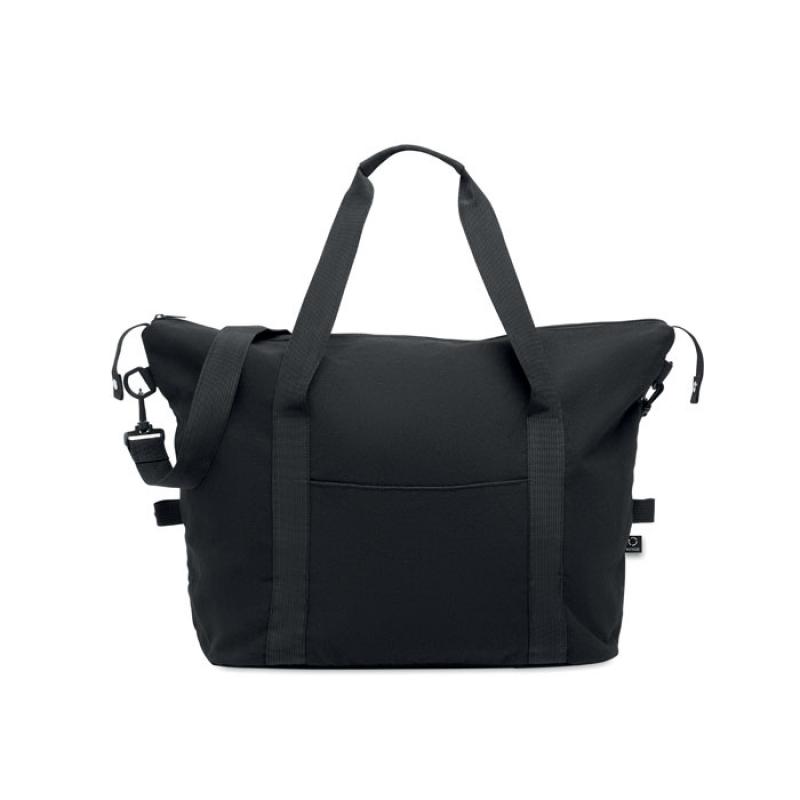 Bolsa de fin de semana de algodón preconsumo reciclado y poliéster reciclado (70%/30%) con forro poliéster RPET 210D. Tiene bolsillo frontal con cremallera, bolsillo trasero y cremallera, una correa para hombro ajustable y desmontable. Fondo acolchado. Soporte trolley.Recipiente :