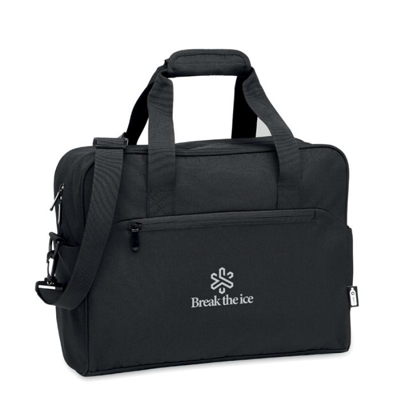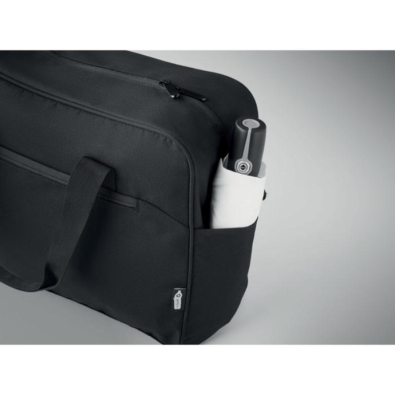 Bolsa de viaje de equipaje de mano de 600D RPET con gran bolsillo frontal con cremallera y dos pequeños bolsillos laterales. Incluye compartimento para portátil de 15''. Correa acolchada extraíble y ajustable para el hombro. Correa para trolley.Recipiente :
