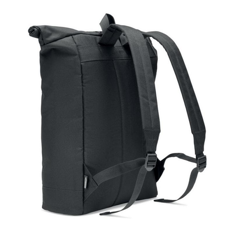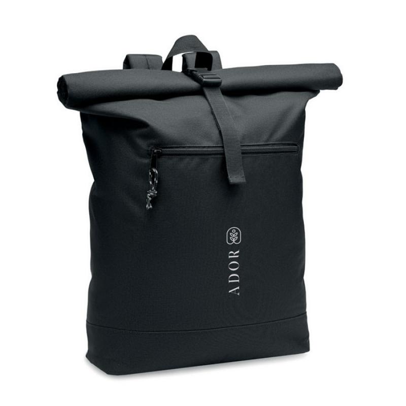 Mochila con cierre roll top en poliéster 600D RPET con respaldo acolchado y refuerzo inferior. Bolsillo frontal con cremallera. El forro es de RPET 210D RPET.Recipiente :