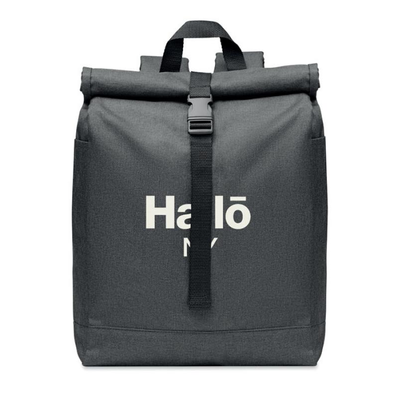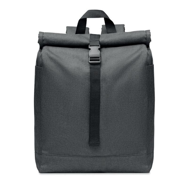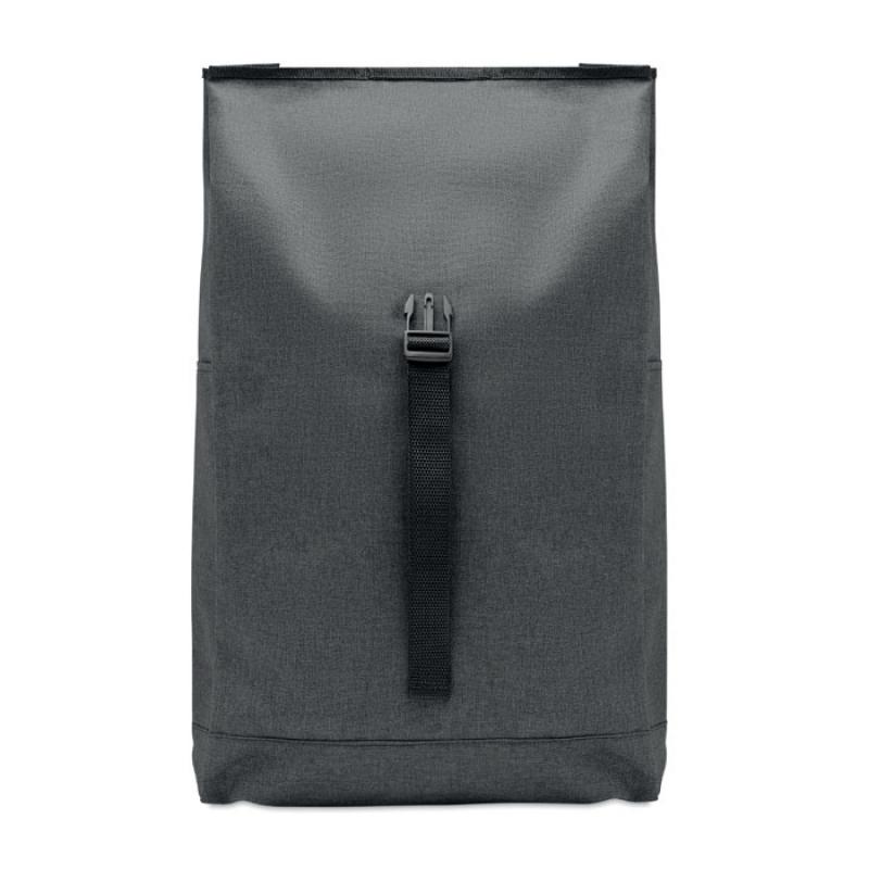 Mochila de poliéster 600D RPET jaspeada con cierre roll top.