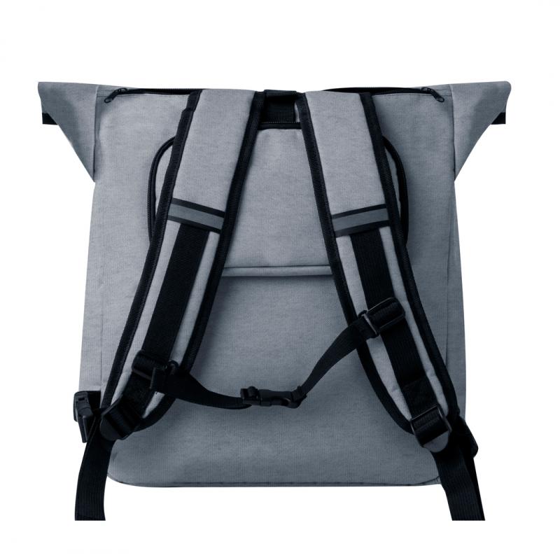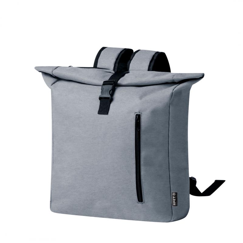 Mochila para bicicleta fabricada en resistente RPET 600D. Versátil y con cierre de hebilla, incluye un práctico bolsillo frontal con cremallera. En su parte trasera cuenta con enganches específicos universales para bicicleta, garantizando una mayor comodidad y seguridad en los desplazamientos. Además, dispone de un asas acolchadas y ajustables para los hombros, para así transportarla con mayor confort cuando se desacopla de la bicicleta. Etiqueta exterior con logotipo RPET.El material RPET se elabora a partir de plástico reciclado, para así fomentar la reutilización de residuos plásticos y ayudar a la sostenibilidad del planeta.