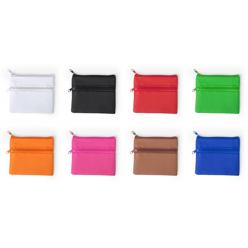 Monedero de alegre diseño con suave cuerpo acabado en brillante polipiel en variada gama de vivos colores. Compartimento principal y bolsillos frontal con cierre de cremallera a juego. Interior forrado a juego.