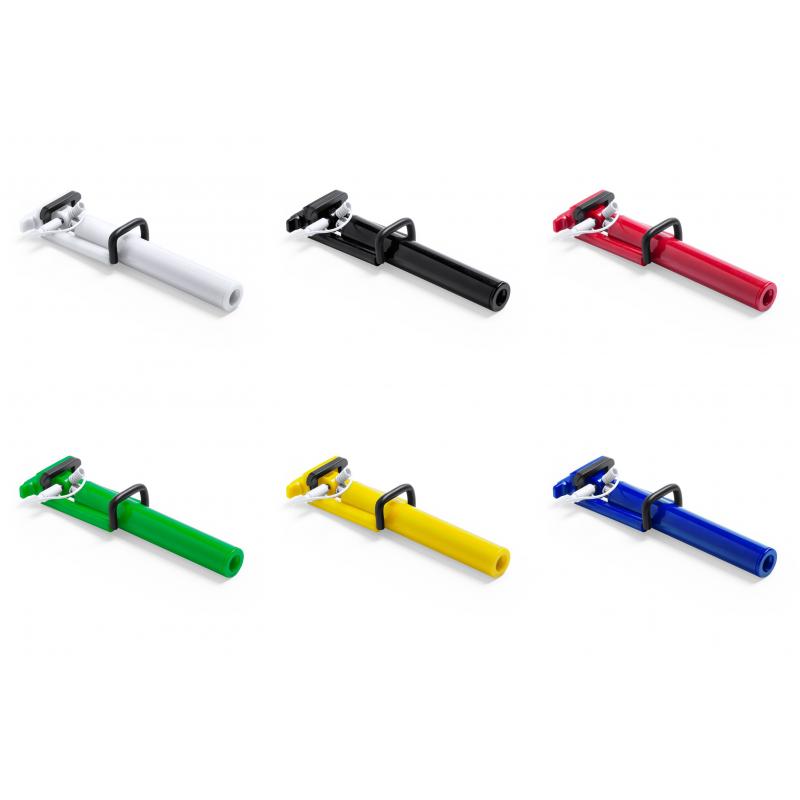 Divertido palo selfie plegable en diseño bicolor con conexión jack de 3,5mm, sistema antigiro y disparador integrado en mango. Recorrido de acero inox y sistema de almohadillas en el soporte para así ofrecer un óptimo ajuste y protección del smartphone, además de una tuerca de ajuste a fijar según la inclinación que se desee, para así hacerse selfies todavía más variados y divertidos. Compatible con todo tipo de smartphones y especialmente diseñado para marcaje en tampografía, con accesorios a juego y presentado en atractiva caja de diseño.