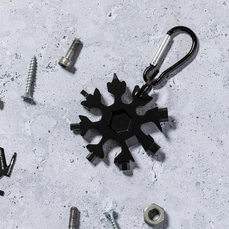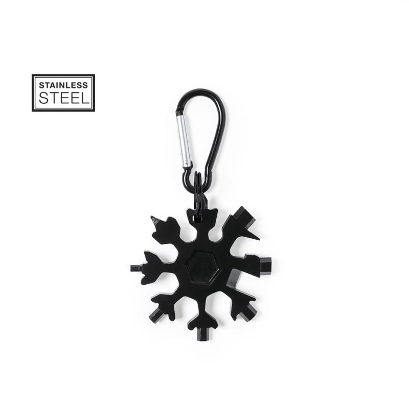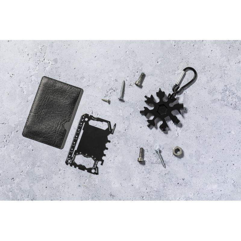 Original y práctica multiherramienta fabricada en resistente acero inox de acabado negro, con anilla y mosquetón de transporte a juego. Con 17 funciones, entre otras, destornillador puntas planas y philips; llaves hexagonales tipo allen; cuchillo y abrebotellas. Presentada en caja individual negra.