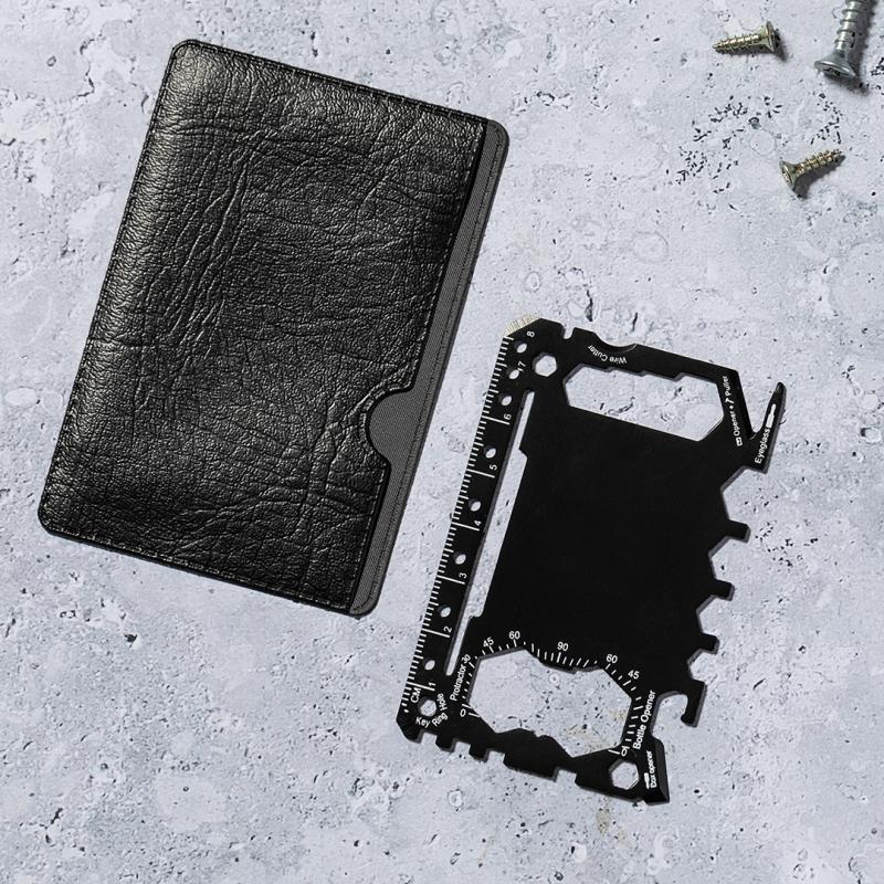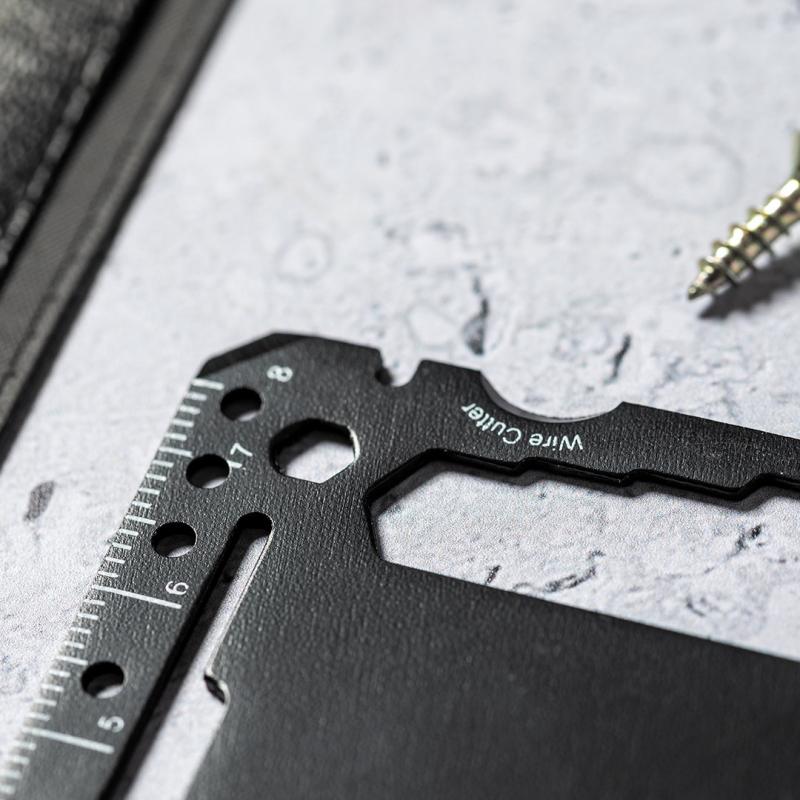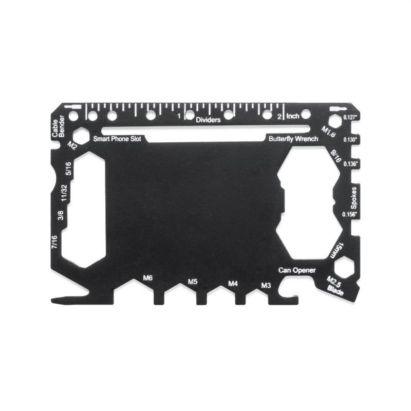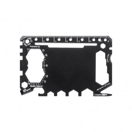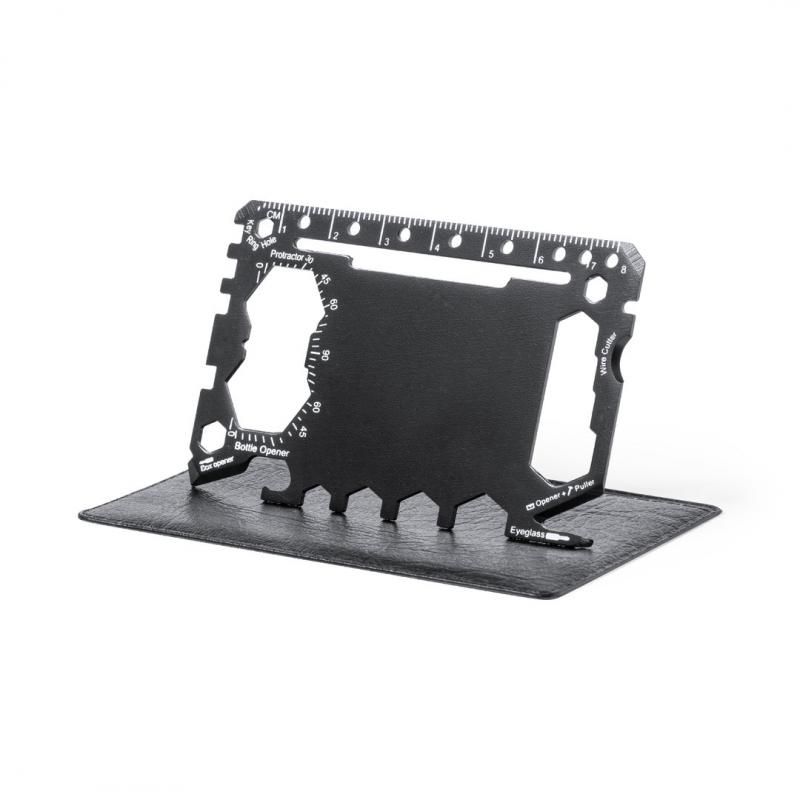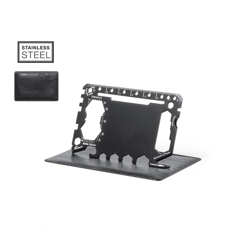 Multiherramienta con resistente cuerpo en acero inox y 17 funciones. Entre otras, funciones abrelatas, cuchillo, destornillador, regla, abrebotellas, llave inglesa, llave de mariposa y transportador de ángulos.