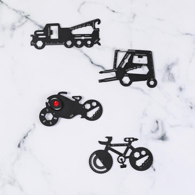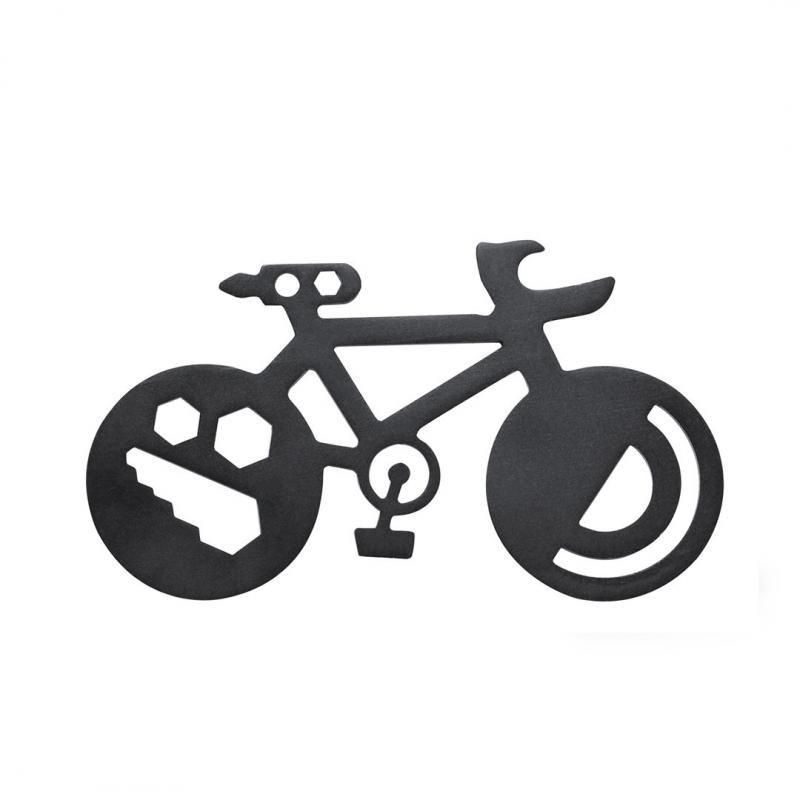 Original y práctica multiherramienta en acero inox con forma de bicicleta. Con 16 funciones, entre otras: destornillador de punta plana y philips, llave para tuercas hexagonales en varios tamaños, regla, transportador de ángulos y abrebotellas. Presentada en bolsa de papel reciclada.