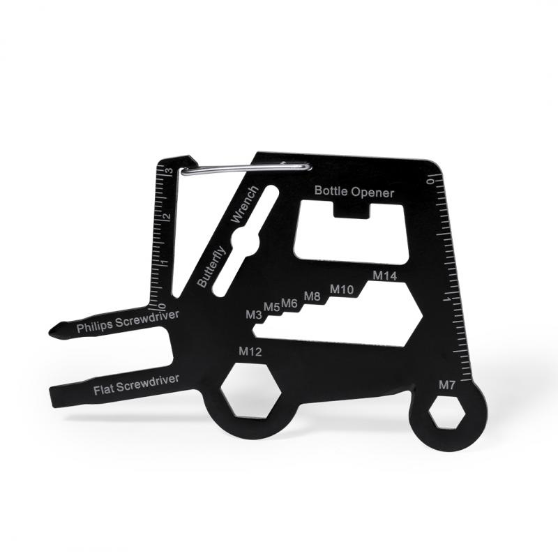 Original y práctica multiherramienta en acero inox con forma de toro mecánico. Con 16 funciones, entre otras: destornillador de punta plana y philips, llave para tuercas hexagonales en varios tamaños, regla, abridor de cajas y abrebotellas. Además de enganche en forma de mosquetón para un fácil transporte. Presentado en bolsa de papel reciclada.