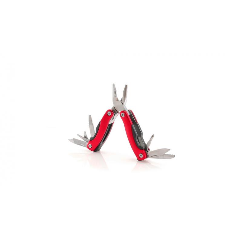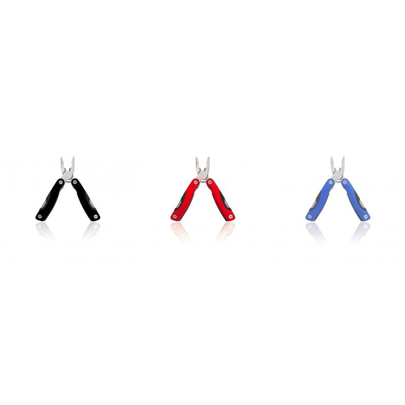 Multiherramienta con resistente cuerpo en acero inox de 12 funciones. Incluye cuchillos y navajas, destornilladores, limas, abridores y alicates. En vivos colores y presentada en resistente funda de poliéster y caja individual.