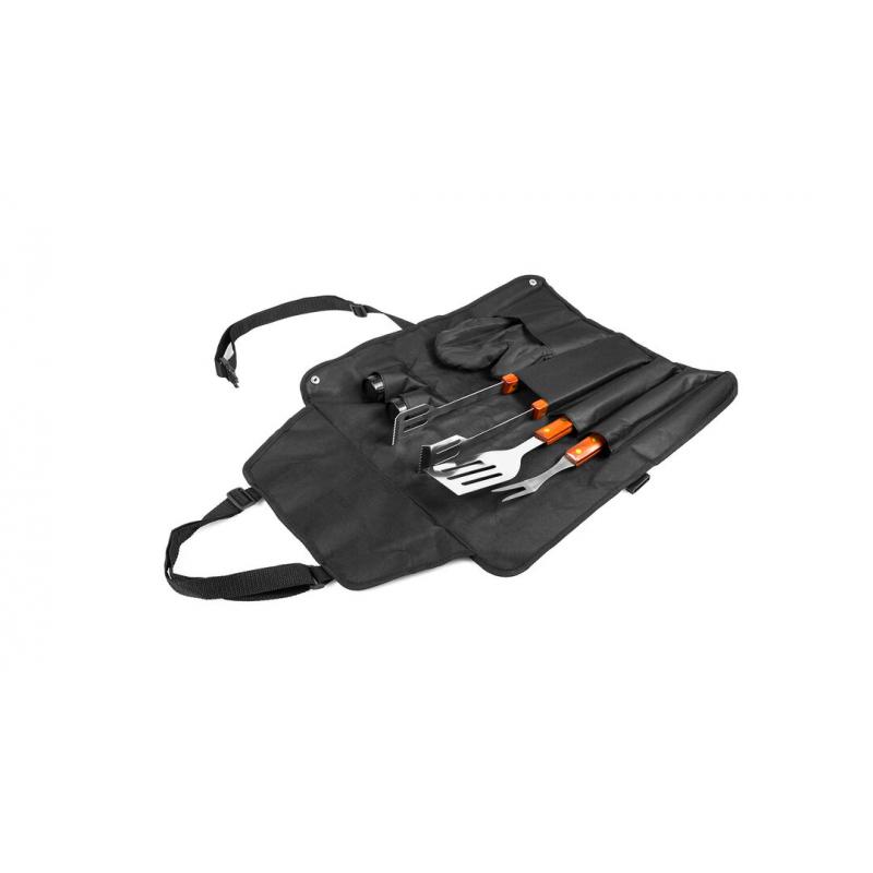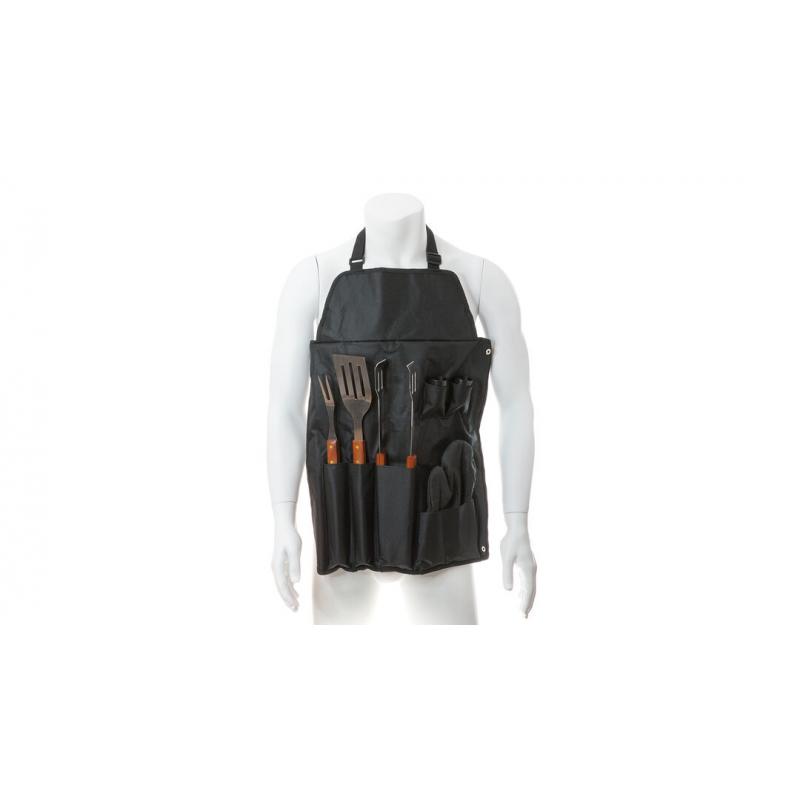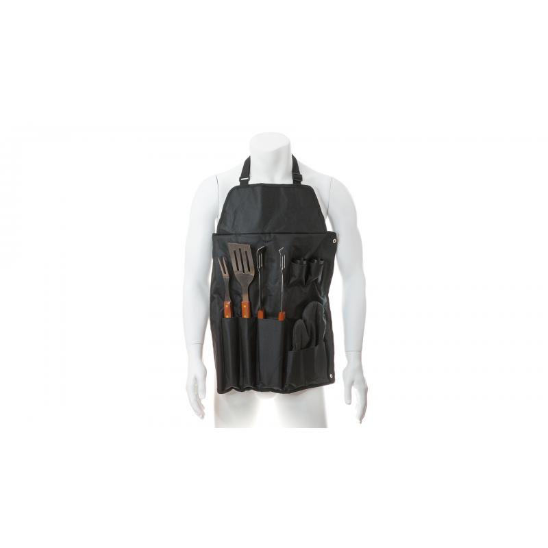Set de barbacoa de 7 accesorios. Incluye paleta, trinchador y pinzas de acero inox con mango de madera. Con manopla acolchada y botes dosificadores para sal y pimienta. Presentado en estuche de resistente poliéster 600D en color negro con cierre de botones metálicos. Con cinta de transporte ajustable con cierre de clic en resistente nylon.