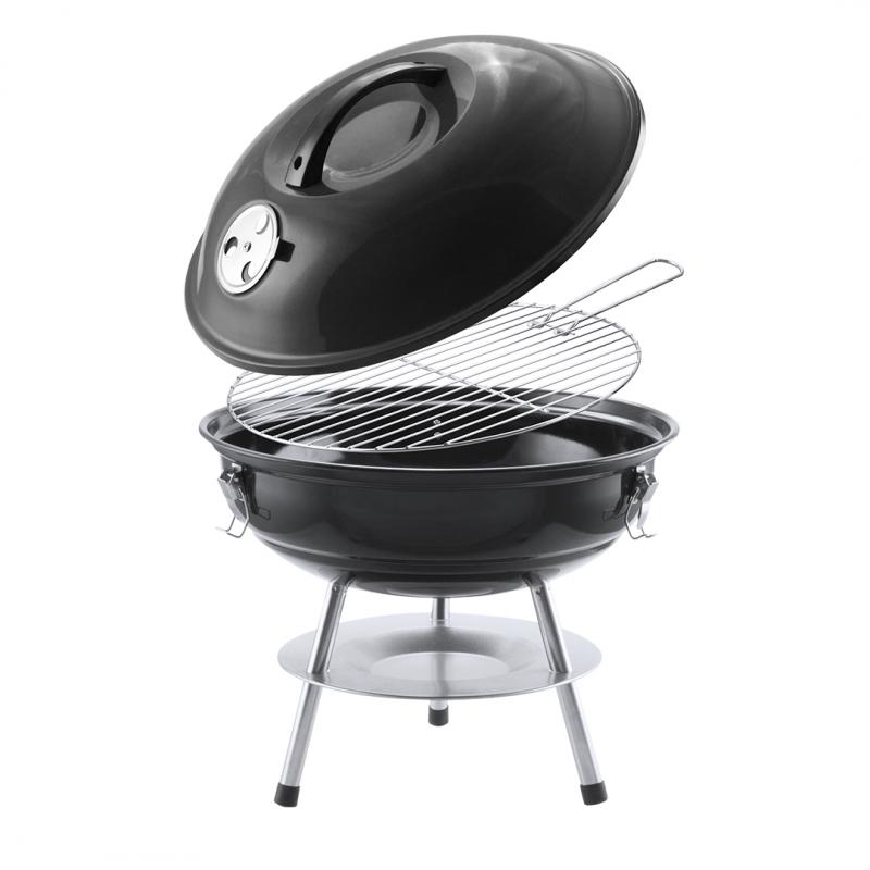 Barbacoa fabricada en resistente acero al carbono de acabado en negro. Tapa con cómoda asa y orificios de ventilación, con parrilla metálica, plato antigoteo y pies antideslizantes. Presentada en atractiva caja de diseño.