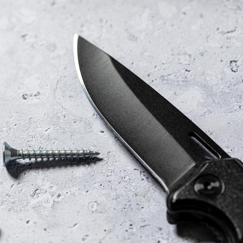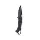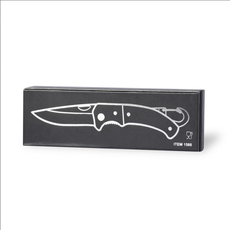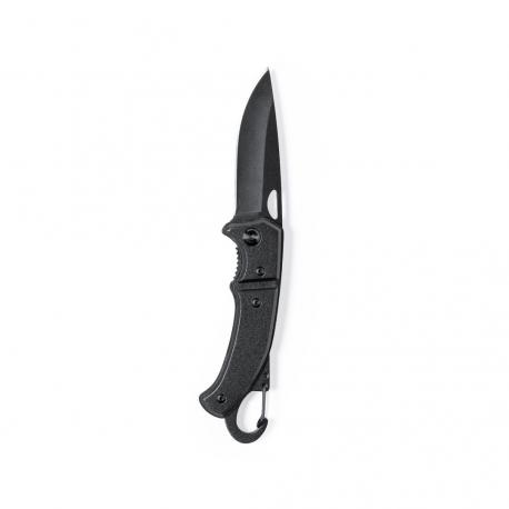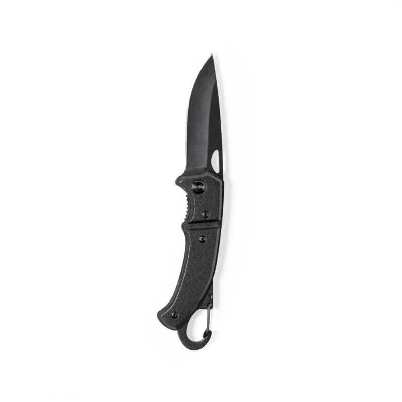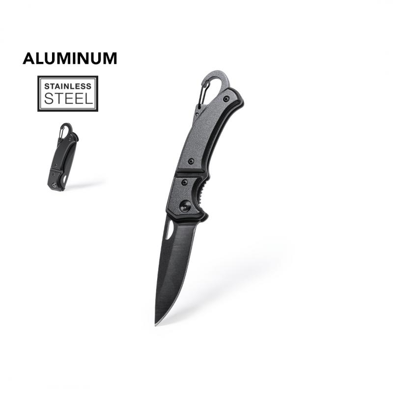 Navaja con hoja en acero inox de acabado negro y resistente empuñadura a juego en aluminio. Con mosquetón integrado en mango y bloqueo de seguridad. Con troquelado en hoja para una fácil apertura y presentada en caja individual de diseño negra.