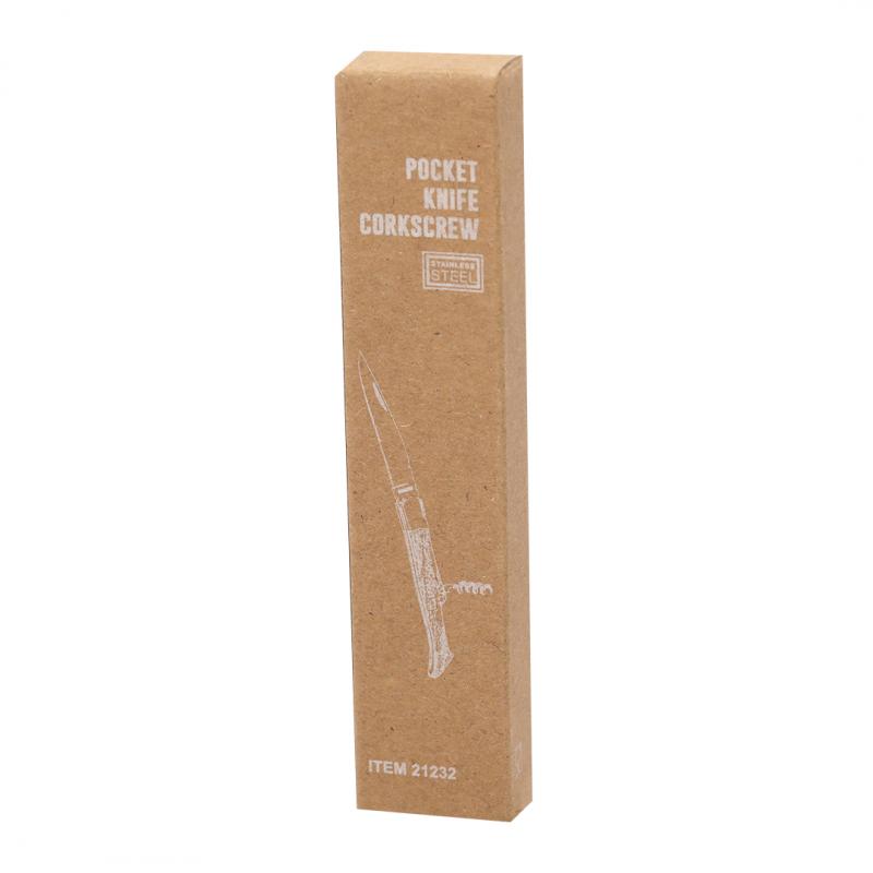 Navaja fabricada en resistente acero inox, con mango ergonómico fabricado en madera natural lacada y sacacorchos integrado. La aleación de la hoja garantiza resistencia a la corrosión y abrasión, siendo ideal para el uso frecuente con materiales duros. La hoja es de tipo punta de aguja, que se caracteriza por su forma puntiaguda, con la parte superior recta. Presentada individualmente en caja de diseño kraft.