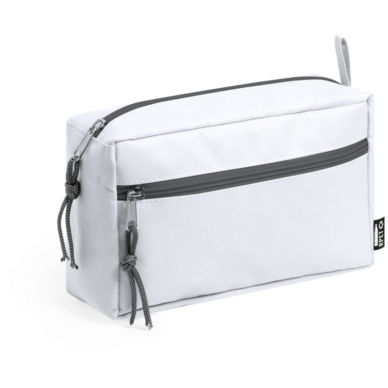 Neceser de línea nature en RPET, elaborado a partir de plástico reciclado, para así fomentar la reutilización de residuos plásticos y ayudar a la sostenibilidad del planeta. Compartimento principal y bolsillo frontal con cierre de cremallera, con cintas en tiradores para cómoda apertura. Asa de transporte a juego y distintivo RPET en etiqueta lateral. Disponible en variada gama de colores.