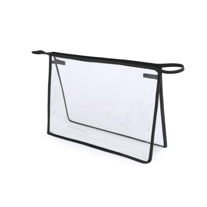 Neceser multiusos en resistente PVC transparente con ribetes de refuerzo en vivos colores. Con cremallera y asa de transporte a juego.