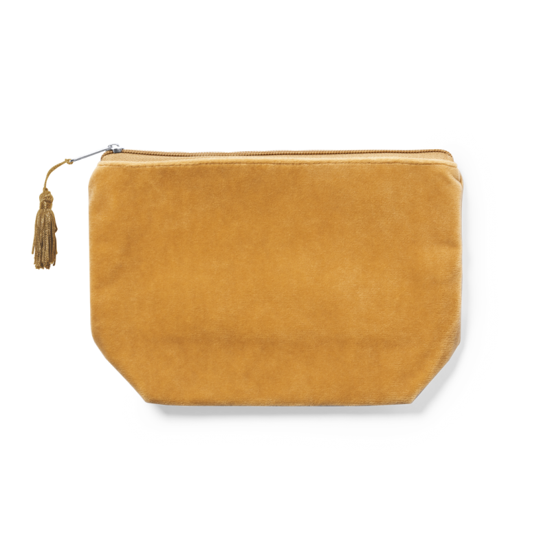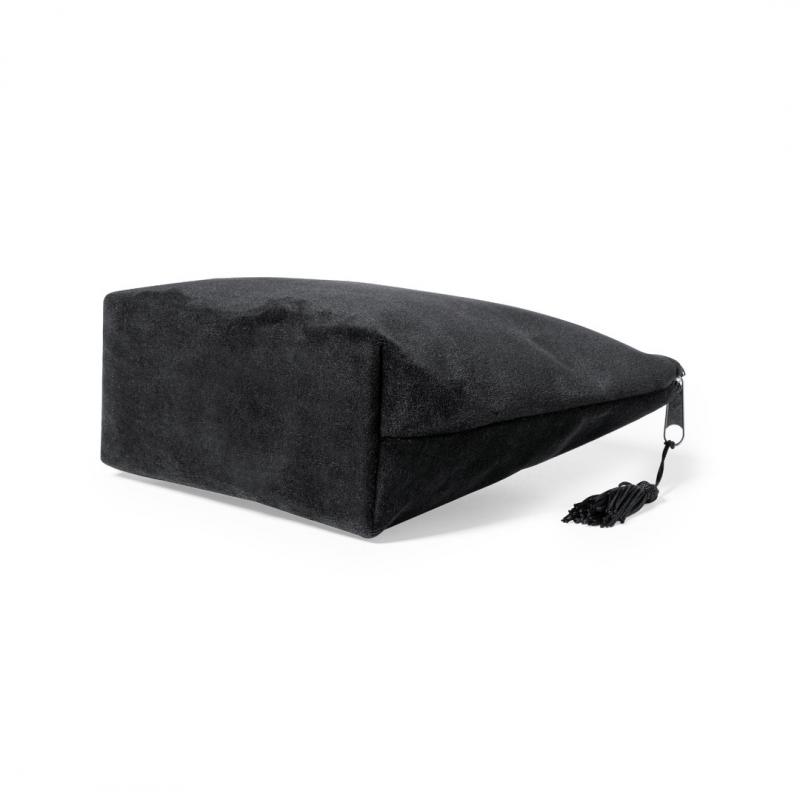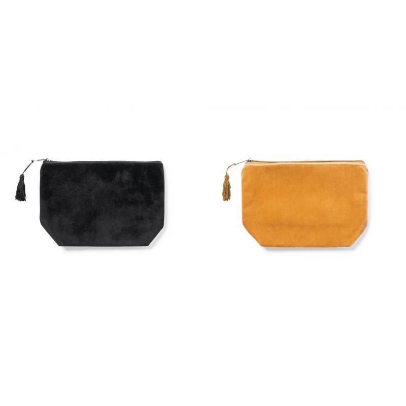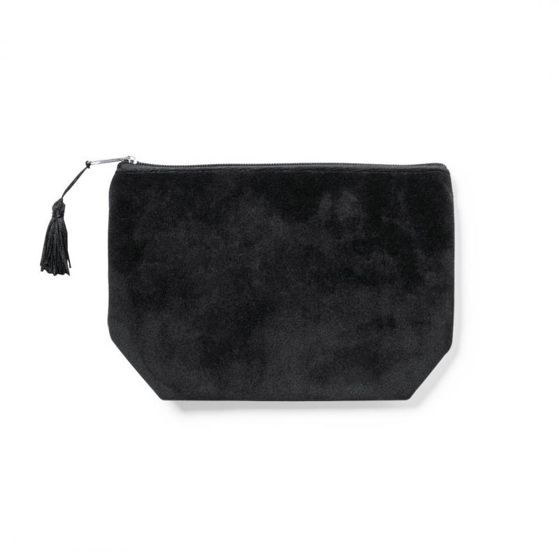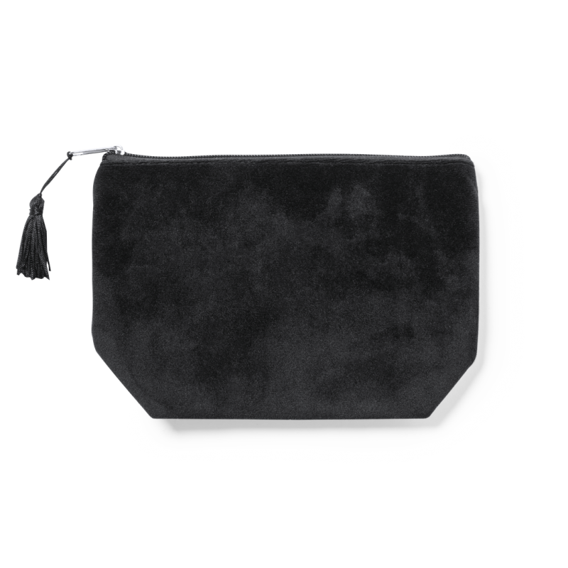 Neceser de tacto terciopelo, con cierre de cremallera y borla en tirador. Fabricado en terciopelo rayón y de acabado cosido, disponible en colores marrón y negro.