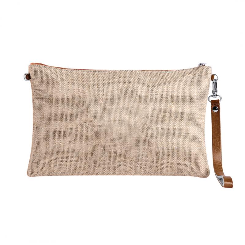 Neceser multiusos en combinación de yute laminado y polipiel. Con cierre de cremallera, tirador metálico y marco central a juego en polipiel de color natural. Presentado en bolsa individual.
