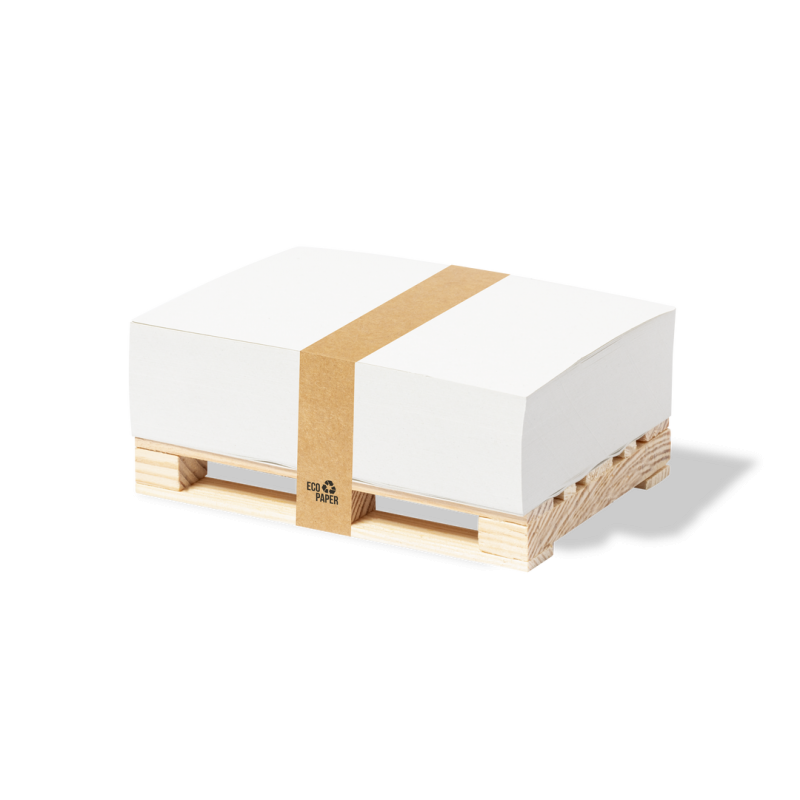 Original portanotas palet fabricado en madera natural. Incluye 300 hojas en papel eco y fajín en papel kraft con distintivo EcoPaper.