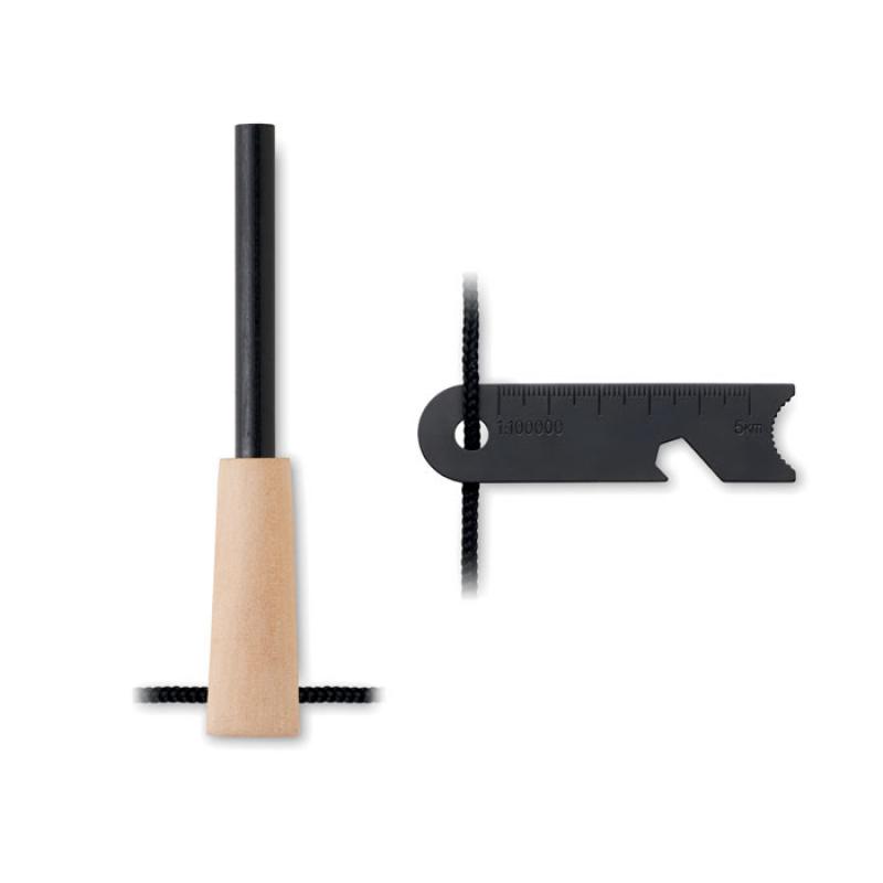 Herramientas para encender fuego en madera de pino y acero inoxidable que incluyen una varilla para encender fuego, un rascador multiusos para utilizar con el encendedor, un abridor de botellas, una regla de precisión y una llave hexagonal.Recipiente :