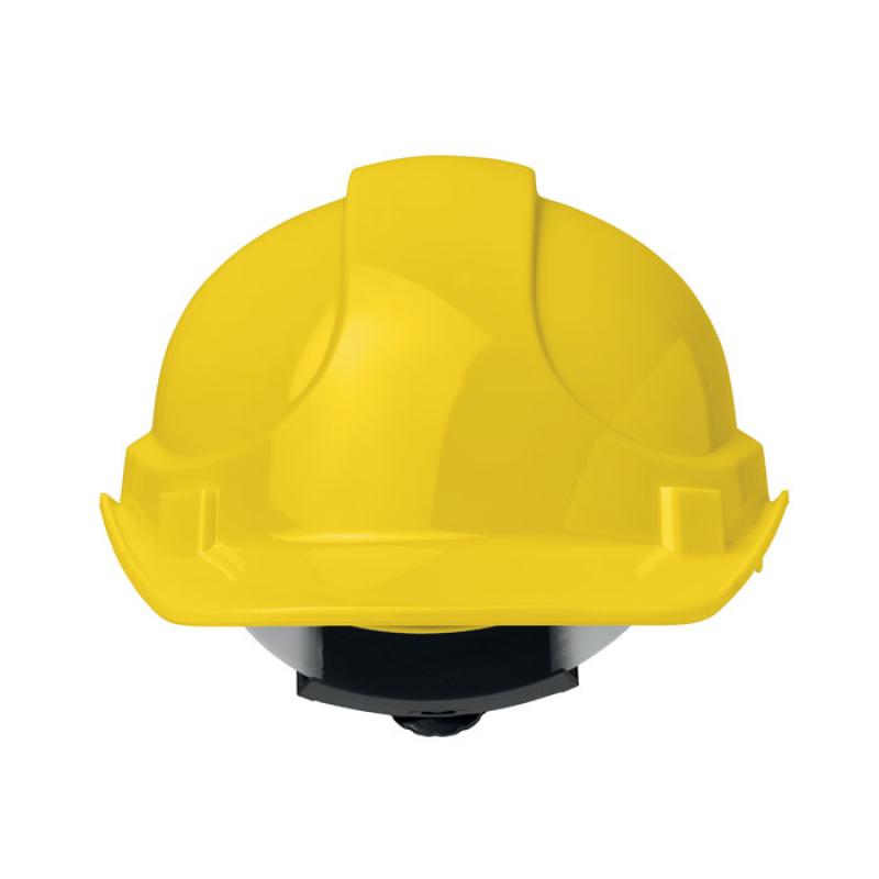 Casco en ABS para constructores y almacenes. Equipado con salidas de aire, correa para la barbilla extraíble y banda para el sudor. Diadema ajustable (50-62cm). EN397Recipiente :