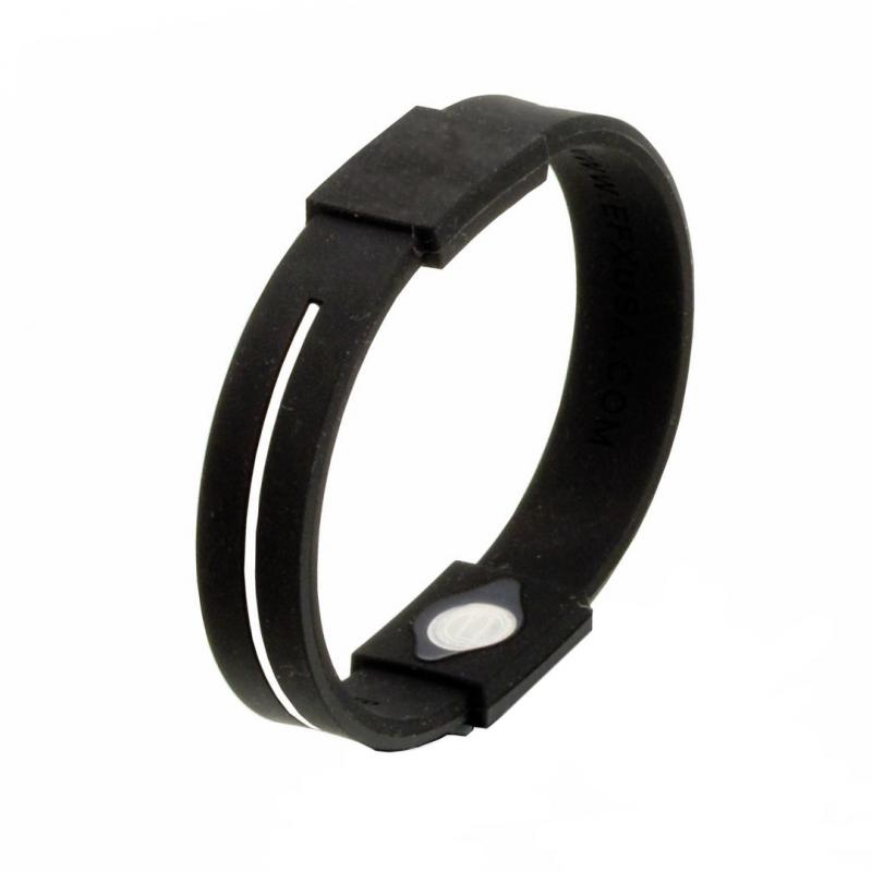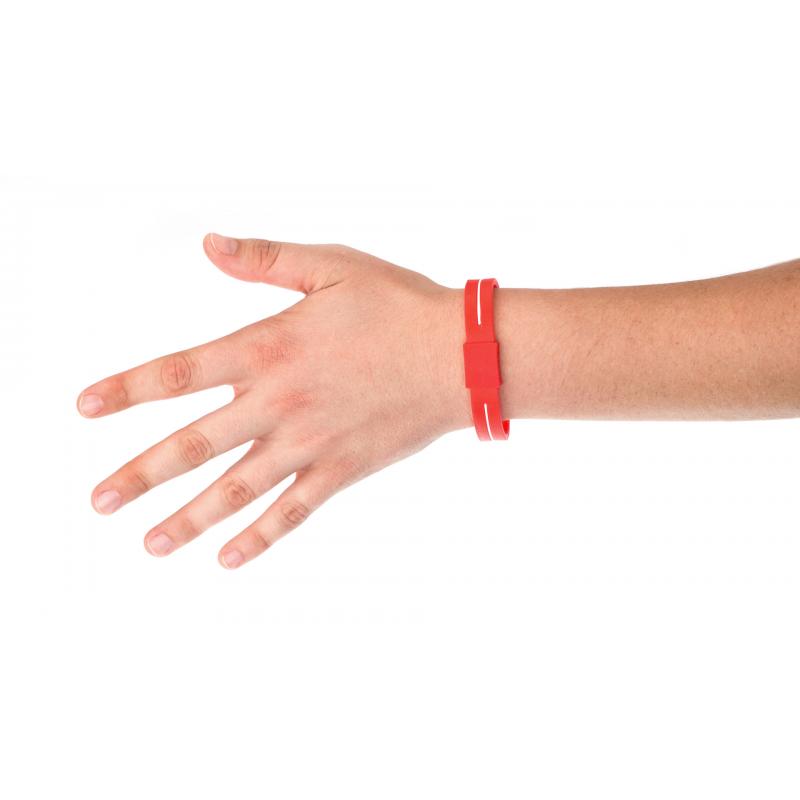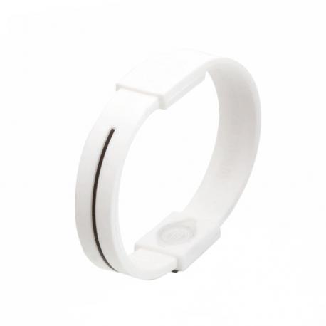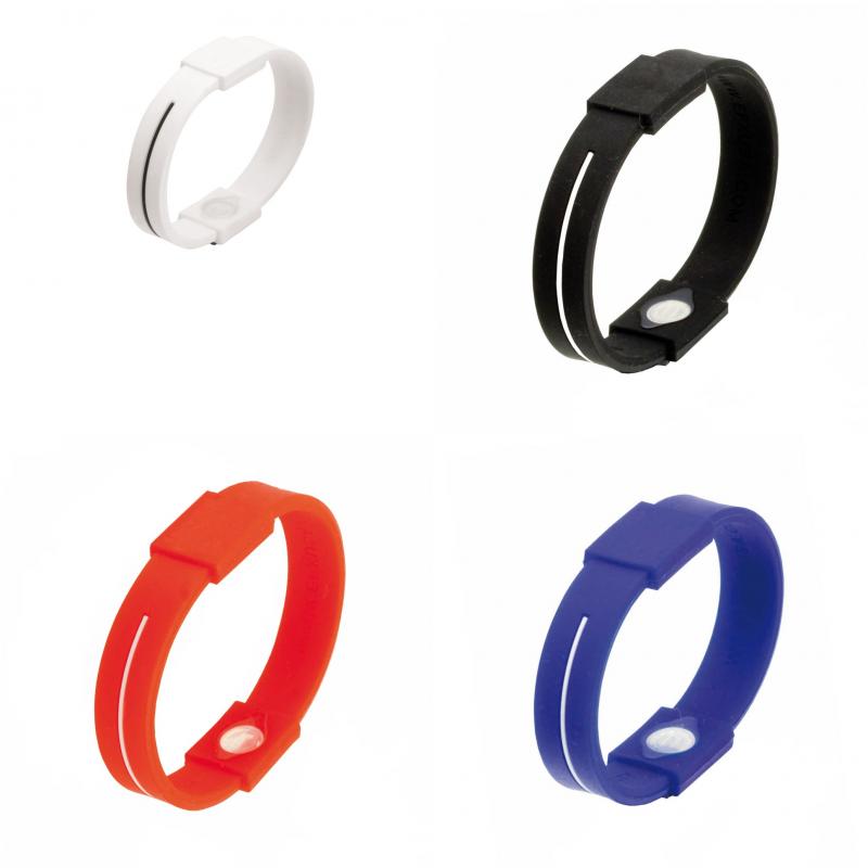 Pulsera de bienestar con tratamiento de iones y cuerpo acabado en suave silicona de vivos colores. Talla única de adulto y con pastilla para marcaje. Presentada en estuche individual con ventana en color negro.