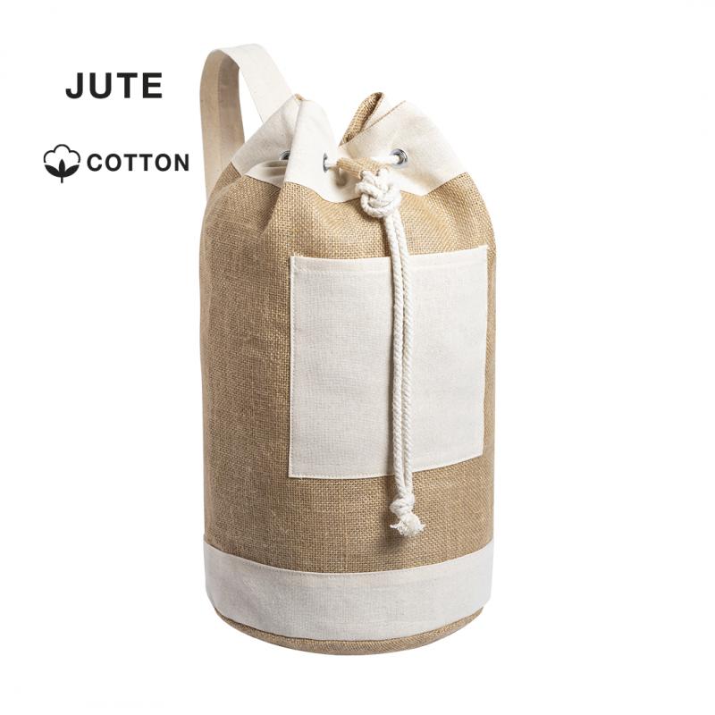 Petate multiusos de línea nature y diseño bicolor. Fabricado en yute, con detalles en algodón. Con cinta ajustable y bolsillo interior. Compartimento principal con argollas metálicas reforzadas y bolsillo frontal para fácil marcaje.