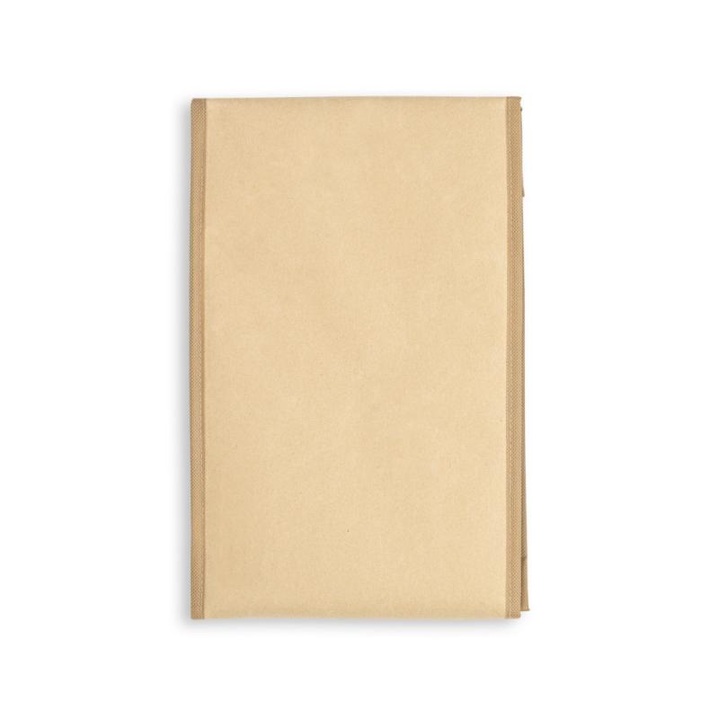 Bolsa térmica hasta 4 L en papel con forro de non.woven e interior con aislamiento térmico de aluminio. Cierre de velcro y bolsillo frontal.Cerrado: 195 x 350 x 110 mm | Abierto: 195 x 410 x 110 mm