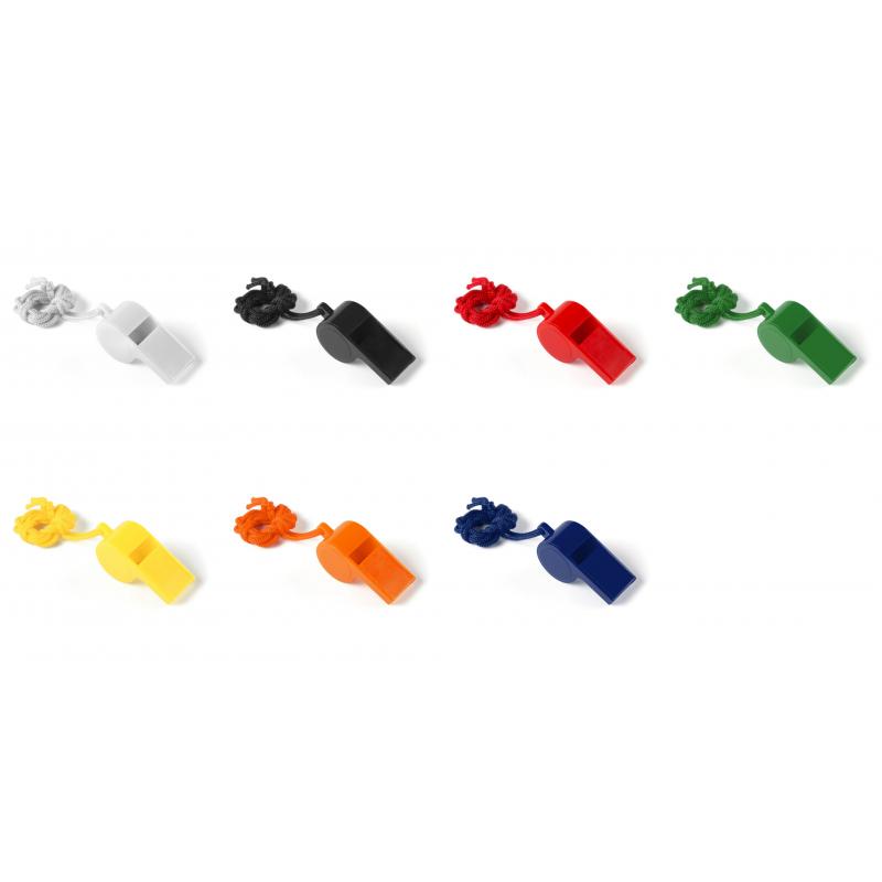 Divertido silbato de clásico diseño en amplia gama de vivos colores con cinta para el cuello a juego.